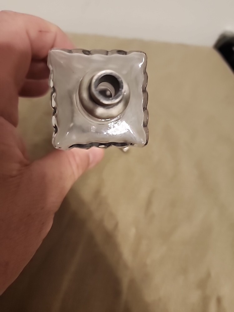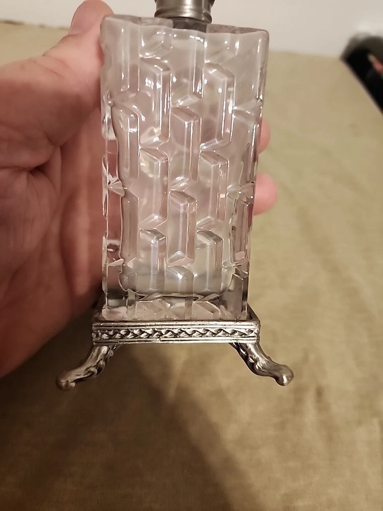Decorative glass with square footed base perfume bottle. I think the silvertone stopper/dauber is pewter, but could be a similar alloy. It is preowned used, and the glass is a little cloudy from previous perfume. Could probably use a good cleaning. Bottle displays well, and although not real old it does have a nice vintage art deco style. Should make someone a nice user and addition to a collection. You will receive exactly what is pictured. Thank you!