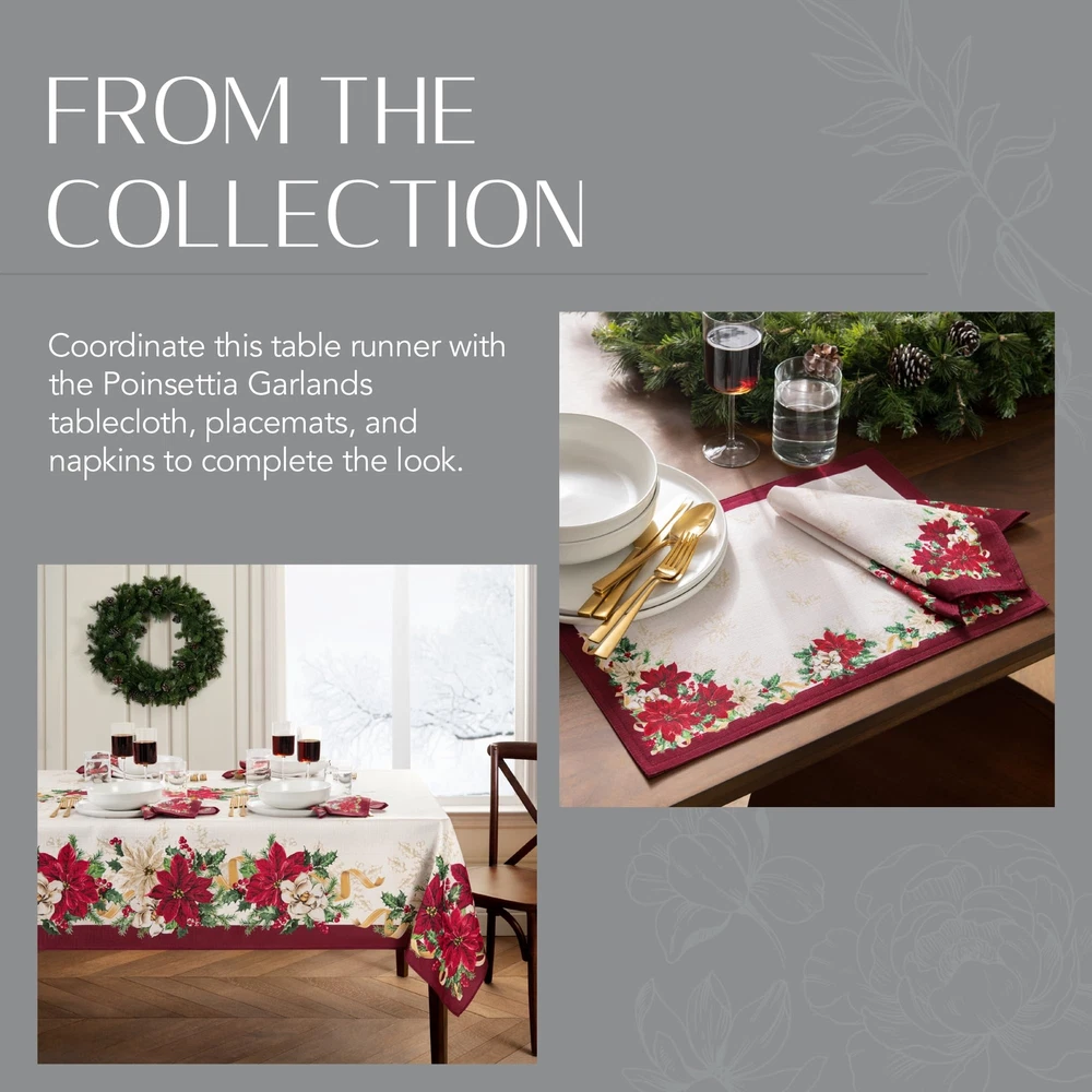 Dress your table in holiday elegance with the Poinsettia Garlands Table Runner. Inspired by traditional winter-holiday decor, this charming fabric table, mantle, or console runner is decorated with deep red and cream colored poinsettia flowers, along with other seasonal blooms, green holly and berries, and gold ribbon accents. On soft ivory ground, this versatile runner also features a classic garnet red bordered design for a festive touch. Excellent for special occasions, events, christmas parties, family gatherings and everyday use during the winter months and holiday season. Soft and durable fabric can be ironed to release stubborn creases and keep your table runner free. Hemmed edges add a finished look and prevent wear and tear. Runner measures 13”x70” and is sold individually. 100% Polyester. Easy care, machine washable. Coordinate to Poinsettia Garlands tablecloth, napkins, and placemats to complete the look. POINSETTIA DESIGN: The Poinsettia Garlands Table Runner is decorated with ruby red and cream poinsettias, seasonal blooms, green holly bunches, and gold ribbon accents over an off-white, ivory ground making it the perfect addition to your holiday decor. PREMIUM QUALITY & DURABILITY: Crafted from high-quality polyester, this reusable table runner is built to withstand frequent use, ensuring it will last through many holiday seasons. VERSATILE USE: Perfect for holidays, parties, events, and everyday use, this table runner is designed to coordinate beautifully with a wide range of dinnerware collections. For a complete look, pair with our matching placemats, napkins and tablecloth. FREE & EASY CARE: Soft and durable polyester fabric is machine washable and can be ironed to release stubborn creases and keep your table runner free. FOUR GENERATIONS OF QUALITY & FASHION: Home Fashions has been designing and producing high-quality home decor since 1922. Committed to quality and design, we specialize in creating products that seamlessly blend functionality with elegance.