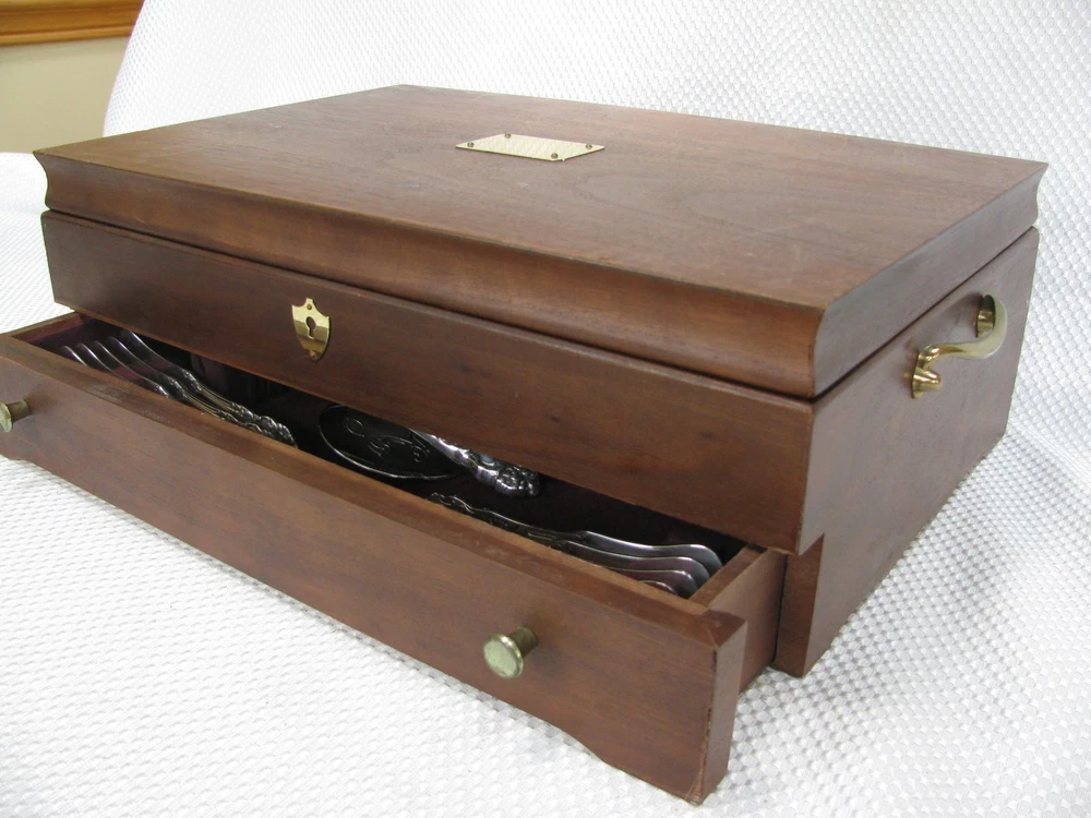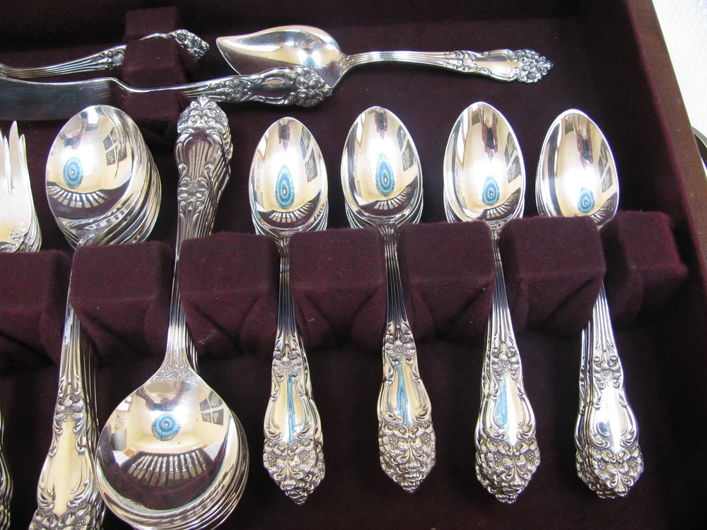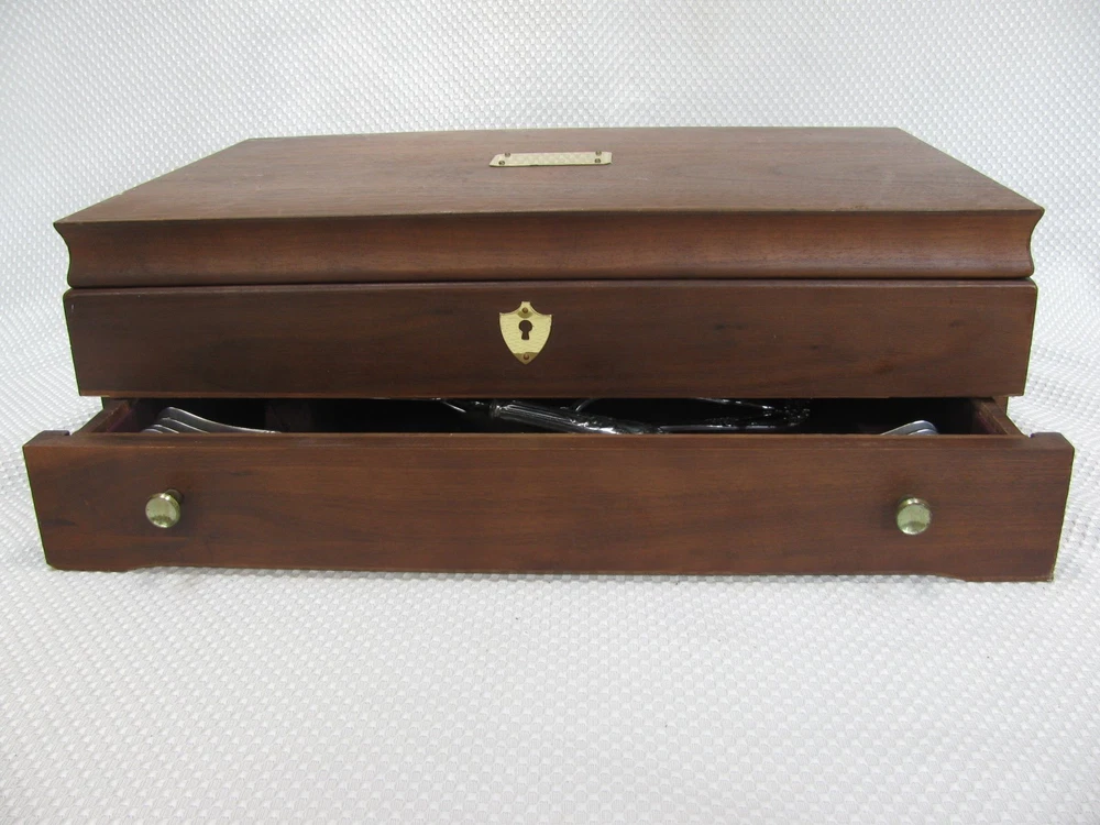 Offered for your consideration is an elegant set of vintage Reed & Barton silverplate flatware in the Tiger Lily or Festivity pattern. This pattern was originally introduced in 1901 as Tiger Lily and then reintroduced in 1945 as Festivity. Included are: 12 dinner knives 9 ½” 12 dinner forks 7 ½” 12 salad or dessert forks 6 ½” 12 round cream soup spoons 7” 24 teaspoons 5 ¾” 12 individual butter knives 5 ¾” 1 pastry server 9 ¾” 1 cold meat fork 8 ½” 1 casserole spoon 8 7/8” 2 solid serving spoons 8 1/8” 1 tomato server 7 ¾” 1 jelly spoon 6” 1 master butter knife 7” 1 sugar spoon 6” Wooden chest The flatware is stamped on the back, “Reed & Barton.” Each piece is in near mint condition. All pieces were carefully hand polished and are ready for your use. The chest is not original to the set, but will serve to keep your flatware safely. Please feel free to ask questions before you buy. This item will be shipped UPS Mail. It will be shipped within 24 hours after payment has been received. dewabit