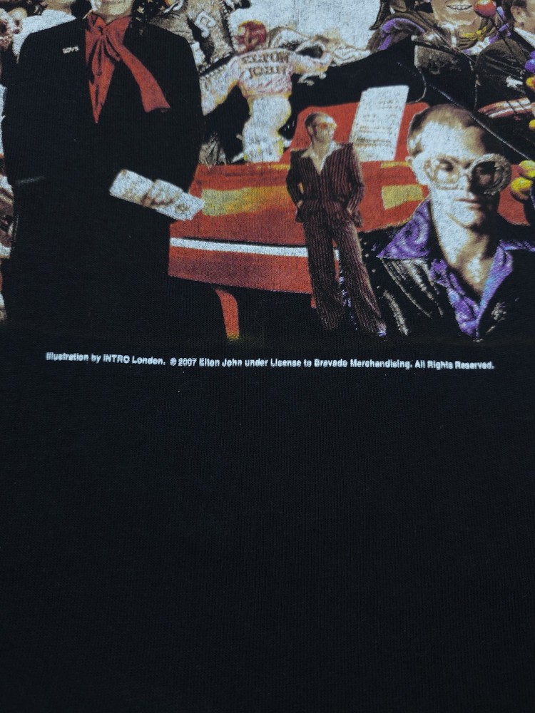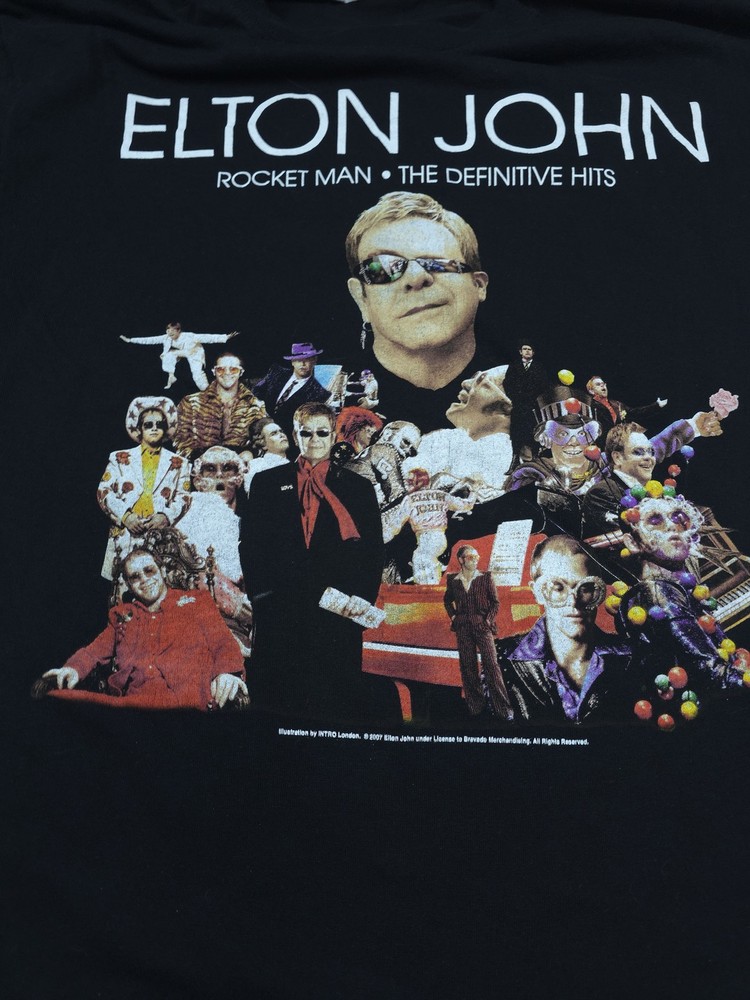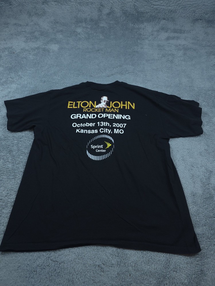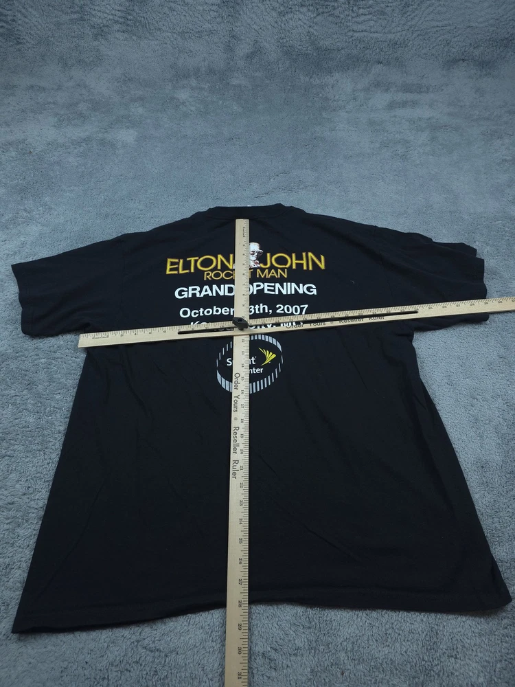 Elton John Shirt Mens 2XL Black Rocket Man The Definitive Hits Sprint Center 2007 Tee Condition: Good used condition. Minor general wear from previous use. No major flaws found. Features large Elton John Rocket Man: The Definitive Hits graphic on front with collage of Elton's looks through the years. Back features "Elton John Rocket Man Grand Opening October 13th, 2007 Kansas City, MO" Sprint Center logo and event details. Official concert tour merchandise. Illustration by INTRO London. ©2007 Elton John, under license to Bravado Merchandising. Shirt tag: Anvil, 100% cotton, Men's 2XL. Classic fit short sleeve crewneck style; tag shows 2X sizing. Approximate measurements shown in photos: 23" pit to pit, 28" length from top shoulder to hem. Color: Black. Multicolor graphic front and white/yellow print back. Collectible event tee for fans and music collectors. Item is in gently used pre-owned condition. Item may contain normal signs of wear, blemishes, discoloration, creases and/or other signs of distress. Photos depict the exact item you will receive. Please refer to photos for full details prior to purchasing. Items are cleaned in accordance with eBay's standards and policies. Fast Free USPS Shipping - 30 Day Returns - Hats Ship in a Box
