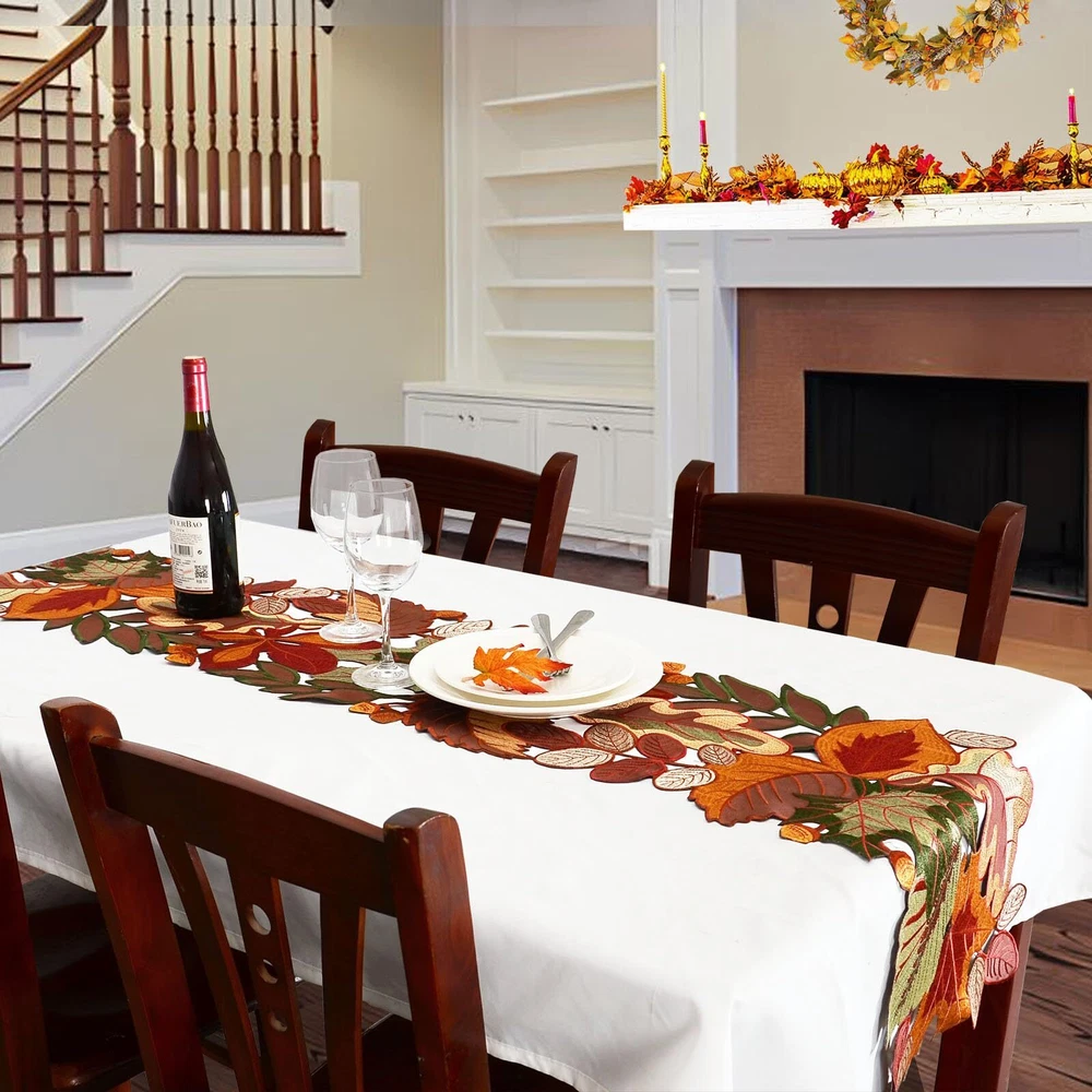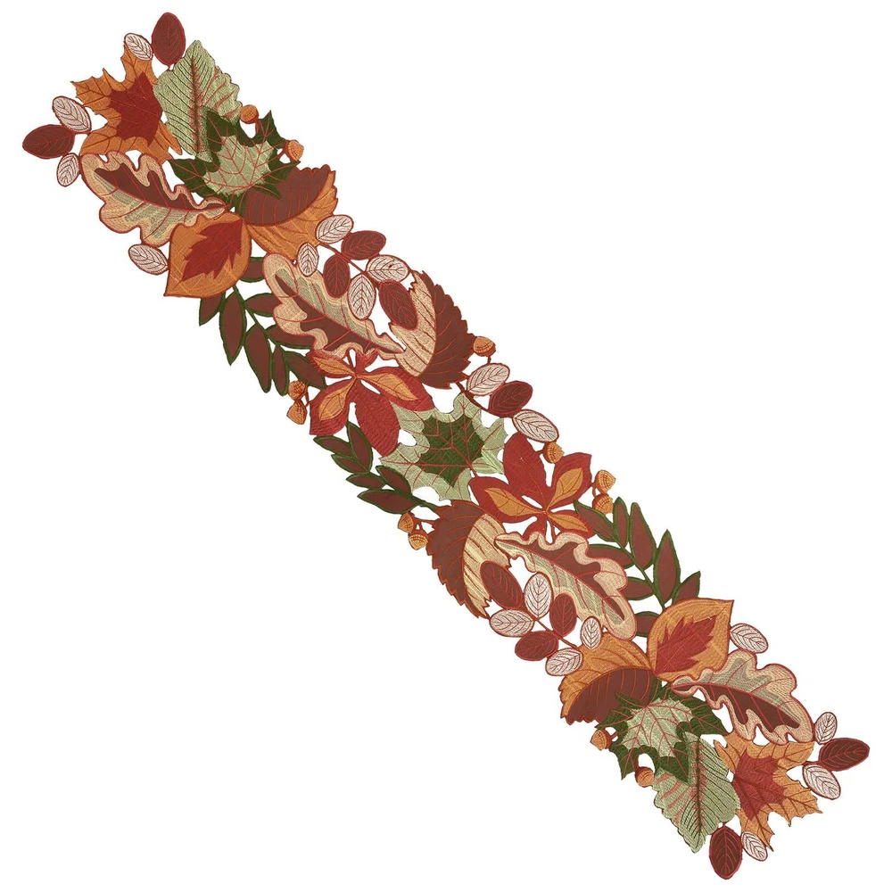 Elevate your home decor with this stunning table runner adorned with an intricate arrangement of fabric leaves in rich autumnal hues. Crafted with meticulous attention to detail, each leaf is expertly shaped and colored, creating a vibrant tapestry that celebrates the beauty of nature. Whether draped across your dining table or adorning a sideboard, this exquisite piece adds warmth and sophistication to any space. With its earthy tones and organic textures, it effortlessly complements a variety of design styles, from rustic to contemporary. Embrace the captivating charm of fall year-round with this remarkable table runner that transforms your home into an inviting sanctuary. Vibrant Fall Decor: This table runner features an array of lifelike autumn leaves in rich hues of burgundy, orange, and brown Versatile Design: The elongated garland style allows it to beautifully adorn tables, mantles or shelves Textured Details: Meticulously crafted with fabric leaves that showcase intricate veining for an ultra-realistic look Easy Care: Simply wipe clean with a damp cloth as needed to maintain its fresh appearance