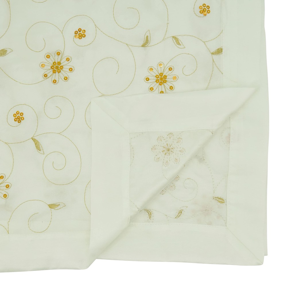 Add a bit of sparkle to your tabletop with this charming Sequined Design Embroidered Table Runner. Featuring a light ivory background and delicate embroidery, the table runner brings an elegant note to your table and elevates the décor. It is a great accent piece for special occasions and entertaining guests. Size: 16"x72" Design is not reversible Runner has no lining Beautiful embroidery, adds a delicate touch. Material: 100% polyester + Care: dry clean