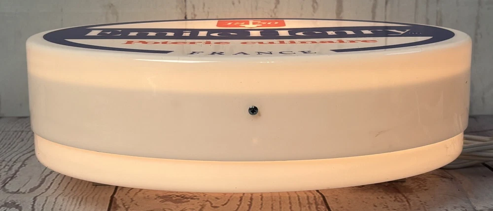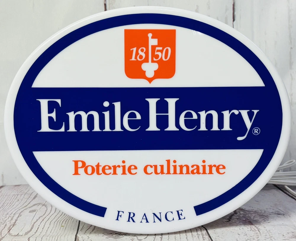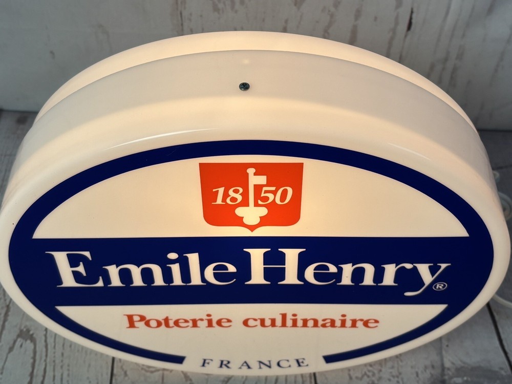 This is an extremely rare Emile Henry lighted plastic store display sign, measuring 12x9.5 inches. The sign features the brand's name in white letters and is an advertising piece for their merchandise and memorabilia. It is a collectible item and would make a great addition to any advertising or store display collection.