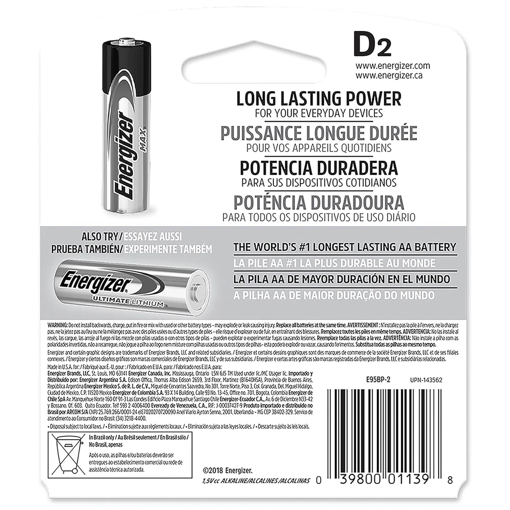 Product Description Energizer MAX D Batteries D Cell Alkaline Lithium General Purpose Batteries 2 Count (Pack Of 6) Energizer MAX D Alkaline Batteries. Energizer provides long lasting power for your everyday devices, whether you need replacement D cell batteries for high-tech flashlights, radios or children's toys. Made to last, not to leak, these Energizer D batteries have a shelf life of up to 10 years, so they're ready to keep your devices operating when you need them most. Each battery pack contains D batteries to keep your supply of backup batteries well stocked. Depend on Energizer MAX D batteries to fuel your everyday electronics, whether you're at home, work or play. Long-lasting power and innovation is what the Energizer MAX family is all about – up to 10-year shelf life for D batteries. Plus, Power Seal Technology is the Energizer innovation that delivers energy you can rely on. Energizer MAX Alkaline Batteries, D, 2 Batteries/Pack Dependable, long-lasting performance in a wide range of devices. Makers of the world's first zero mercury AA alkaline (commercially available since 1991); battery can be disposed with regular household trash. 10-year shelf life. Battery Type: Alkaline; Battery Size: D; Voltage: 1.5 V; Material(s): Alkaline Manganese Dioxide. Long-life alkaline From the Manufacturer Made in U.S.A. 2 pack of Energizer MAX D Batteries, Batteries D Size These alkaline D batteries provide long lasting power for your everyday devices The power you depend on for high-tech D battery flashlights, radios, toys and other high-drain devices MAX D alkaline batteries that hold power for up to 10 years in storage Energizer MAX D batteries are made to last. Not to leak Feel confident knowing you have the long-lasting power and protection you expect from Energizer MAX D battery pack that holds power for up to 10 years in storage D Alkaline batteries that are made to last. Not to leak. Also available in AAA batteries, AA batteries, C batteries and 9V batteries Alkaline batteries provide a long-lasting power source Use in calculators, Pencil sharpeners, cameras, flashlights and more Package Dimension : 3.4 centimeters L x 9.3 centimeters W x 13.0 centimeters H Country of Origin: UNITED STATES