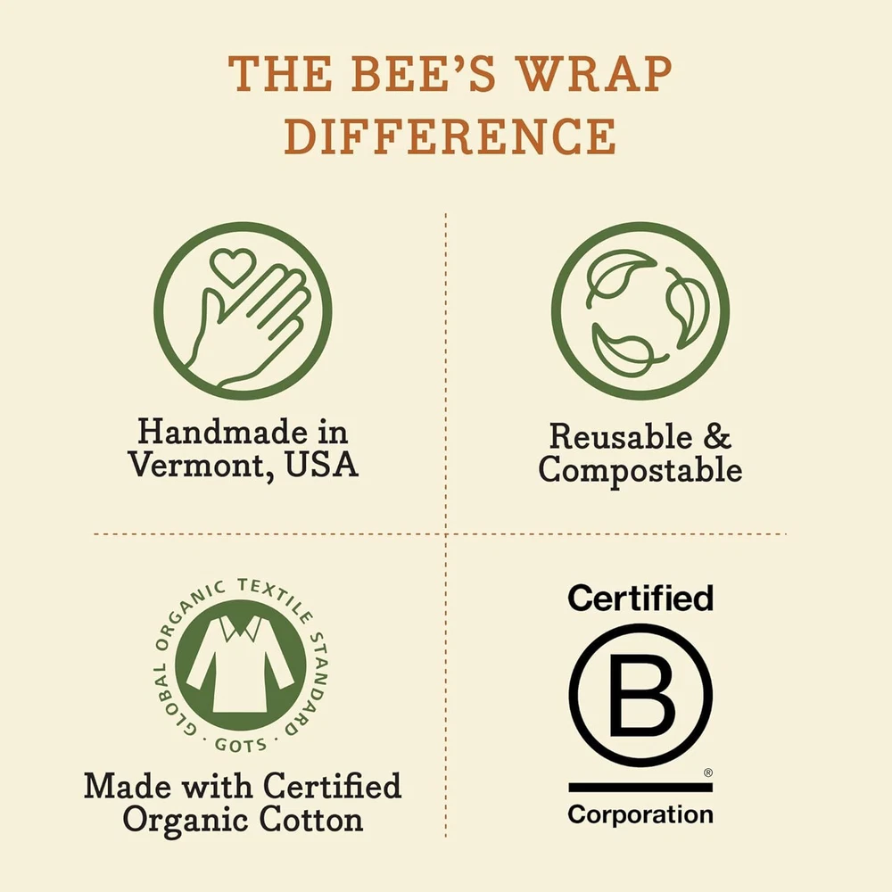 Bee's Wrap Reusable Beeswax Food Wraps Made in The USA, Eco Honeycomb Product Details Product Dimensions: 7.5 x 4.3 x 0.15 inches Item Weight: 1.92 ounces Manufacturer: Bee's Wrap Country of Origin: USA Item model number: 1533003 Is Discontinued By Manufacturer: No ECO FRIENDLY REUSABLE FOOD WRAPS are here to eliminate single-use plastic wrap from your kitchen. The green alternative to plastic food storage, our beeswax food wraps keep your food fresh without plastics, unlike traditional food storage containers or single use sandwich bags. A great alternative to bread bags. ALL NATURAL wraps are made in the USA and contain organic cotton, beeswax, organic plant oil, and tree resin - free from toxins and unnecessary chemicals. Say goodbye to plastic wrap - our beeswax wraps are durable, reusable, and washable, making them a sustainable kitchen storage essential and the ideal alternative to plastic wrap. VARIETY PACK OF THREE WRAPS in assorted sizes for all of your food storage needs. Use our small wrap (7" x 8") for half a lemon, onion or avocado; the medium wrap (10" x 11") for cheeses, a sandwich, or snack; and the large wrap (13" x 14") for covering a salad bowl or pie. Say goodbye to plastic wrap and hello to sustainability. Great for back to school and school lunches. TO USE warm the wraps with your hands to make them pliable and shapeable to your specific food storage needs. The wrap will maintain shape when it cools, creating a secure seal and keeping food fresh. To clean, hand wash the beeswax wrap with cool water and mild soap, then air dry. REUSE YOUR WRAPS for up to a year with proper care. Bee's Wrap can be composted or used as a fire starter at the end of its life, making it a truly eco-friendly food storage solution. With a variety of sizes and patterns, our wraps are the perfect housewarming gift, gift for teachers, gifts for mom, or hostess gifts.