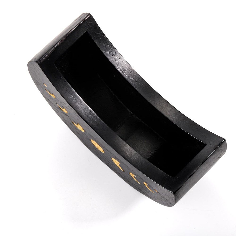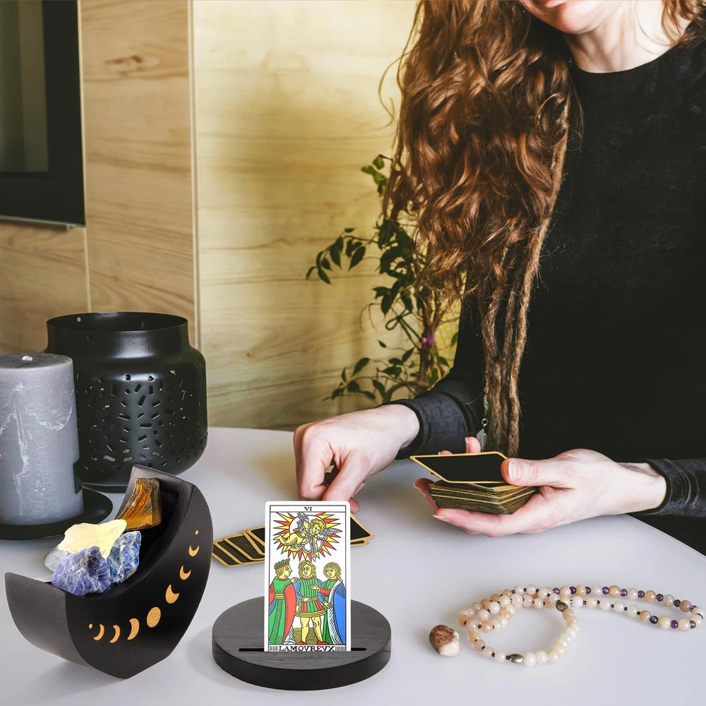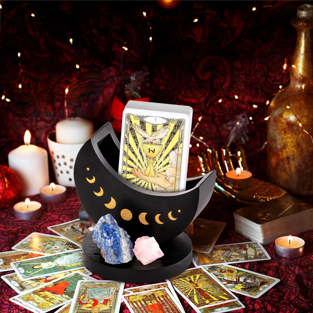 The round base of our tarot deck holder with moon shape case measures a thickness of 0.6 inch and 4.3 inch in diameter. The moon shape case measures 4.7" x 4.1" x 2.0", 3.9" in inner length and 1.2" in inner width, which is big enough to hold tarot, oracle, or any other type of card deck. Our wood tarot card stand case is made of high-quality wood that is light but sturdy and durable. And the careful package makes sure our deck holder in good condition. Our tarot card stand case is crafted in the shape of a curved moon with a round base matched together and is carved golden moon phase pattern. And there is a slot on the base for placing a daily card. The altar supply meditation accessories case features a hidden magnet design that connects the moon shape container and and the round base so that you can rotate the moon shape case as you like. This witchy decor organizer is a distinctive mystical addition to your altar or desk in your room or office to connect you with natural super power or simply decorate your space. It would also be a remarkable gift for your friend as a tarot fan. Premium Material: Our wood tarot card stand case is made of high-quality wood that is light but sturdy and durable. The surface is smoothly finished and evenly colored black. And the careful package makes sure you will receive our deck holder in good condition. Perfect Size: The round base measures a thickness of 0.6 inch and 4.3 inch in diameter. The moon shape case measures 4.5" x 4.1" x 2.1", 3.9" in inner length and 1.2" in inner width, which is big enough to hold tarot, oracle, or any other type of card deck. Exquisite Design: Our tarot card stand case is crafted in the shape of a curved moon with a round base matched together. On both sides of the moon case are delicately carved moon phase pattern, which shine gold against the black tone, making our showcase aesthetically pleasing. And there is a slot on the base for placing a daily card. Magnet Connection: Our altar supply meditation accessories case features a hidden magnet design that connects the moon shape container and and the round base. You can easily rotate the moon shape case to any angle to face you as you like, creating an enchanting ambiance for you while meditating or working. Special Decoration: Our witchy decor organizer is of mysterious psychic witchy atmosphere, making it a distinctive addition to your altar or desk in your room or office to connect you with natural super power or simply decorate your space. It would also be a remarkable gift for your friend as a tarot fan.