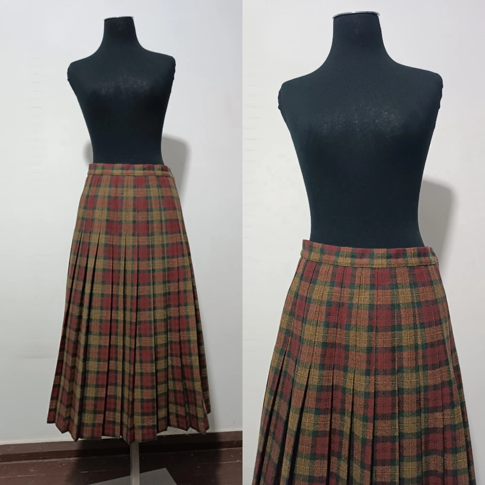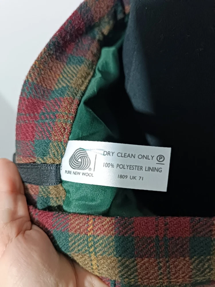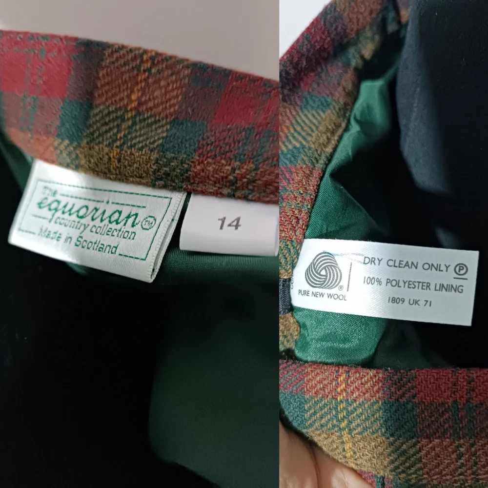 length 80 cm/31,5" width at waist half girth 36 cm/14" width at hips 72 cm/28" 100% virgin wool with quality mark, lining 100% polyester Made in Scotland.