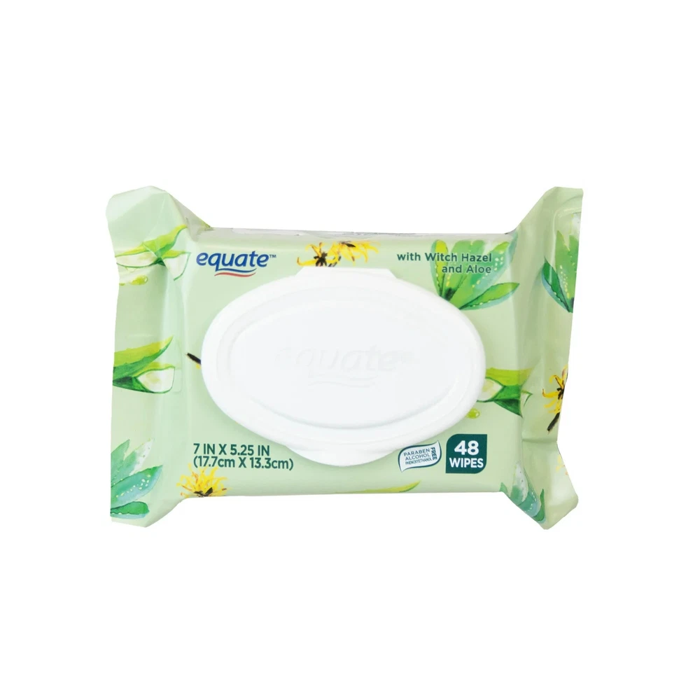 About this item Product details Enhance your bathroom experience with Equate Witch Hazel and Aloe Scented Flushable Wet Wipes. Infused with chamomile, aloe, and vitamin E these soft wet wipes leave you feeling clean and fresh with the scent combination of Witch Hazel and Aloe. This pack contains two packages with 48 wipes each - totaling 96 wipes. The Easy Pop-Ups® Dispensing, resealable closure ensures the wipes stay moist and allows for easy access whenever you need them. Made with 100% plant-based fibers these clean quilt wipes are alcohol-free, paraben-free, dye-free, and phenoxyethanol-free with no harsh ingredients to provide a refreshingly clean experience. Making the right health decisions can be challenging. With a complete range of products and simple solutions, Equate allows you to take care of your family with confidence. Contains 2 Flip-Top Packs each containing 48 Wipes - 96 Total Flushable Wipes Witch Hazel and Aloe Scented Hypoallergenic Contains Aloe and Vitamin E Alcohol, phenoxyethanol and paraben free Great for the whole family! Easy Pop-Up Dispensing Made with 100% plant-based fibers Meets INDA flushable product guidelines (See disposal instructions) Wipes measure 7” x 5.25”