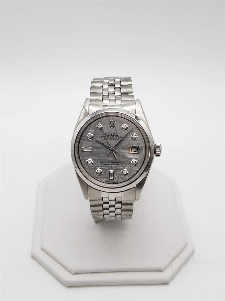 Item Description: Mens ROLEX 36mm DATEJUST in SS and a METEORITE DIAL with Natural VS G Baguette and Round Diamonds. HIGH GRADE piece and one stunning ROLEX. Retail $14,000. 7.3 inches long and so nice. WOW!!! Just serviced and runs and keeps time. GORGEOUS. Just serviced and runs and keeps time. This is a service that ROLEX would charge around $2000 for..you get it for peace of mind at no additional charge. WOW!!! Get a steal. Brand: Rolex Metal: SS Movement: AUTOMATIC Gram Weight: 83g Powered by SixBit's eCommerce Solution