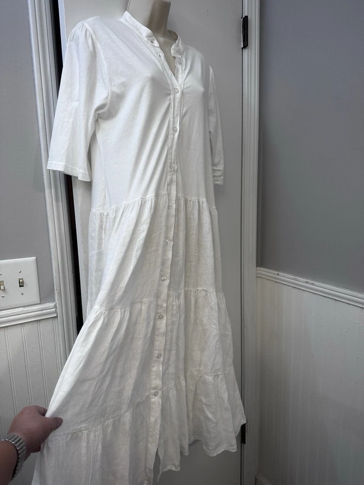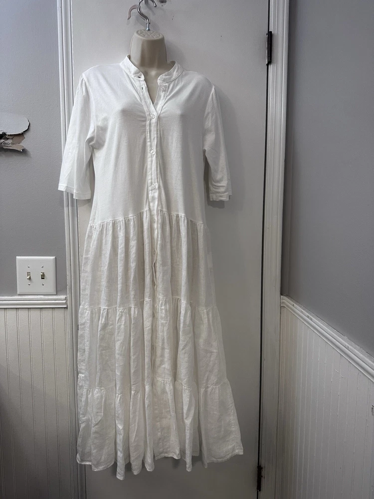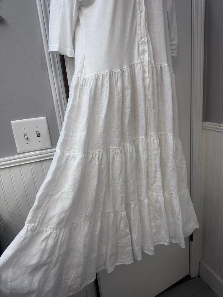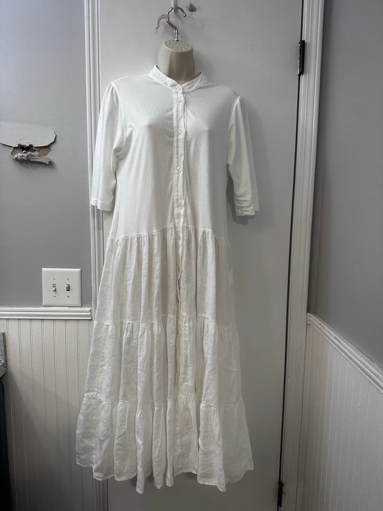 Perfect condition. Based on measurements it is size M/L. Please measure the pit to pit on another dress that fits you well to see if 17.5” is your size. This elegant Etici white linen maxi dress, crafted in Italy, is a timeless piece for any wardrobe. The dress features a button-front design, giving it a classic and versatile look. With a relaxed, tiered silhouette and 3/4 sleeves, it’s perfect for warm-weather occasions or layering with a cardigan for cooler days. Made from 100% linen, this dress offers a lightweight and breathable feel, ensuring comfort throughout the day. The high-quality Italian craftsmanship shines through in every detail, making it a chic choice for a casual day out or a special event. In excellent condition with no visible flaws. Etici dress, women’s white dress, linen maxi dress, button-front dress, Italian dress, tiered dress, summer dress, breathable dress, casual maxi dress, 3/4 sleeve dress, size L