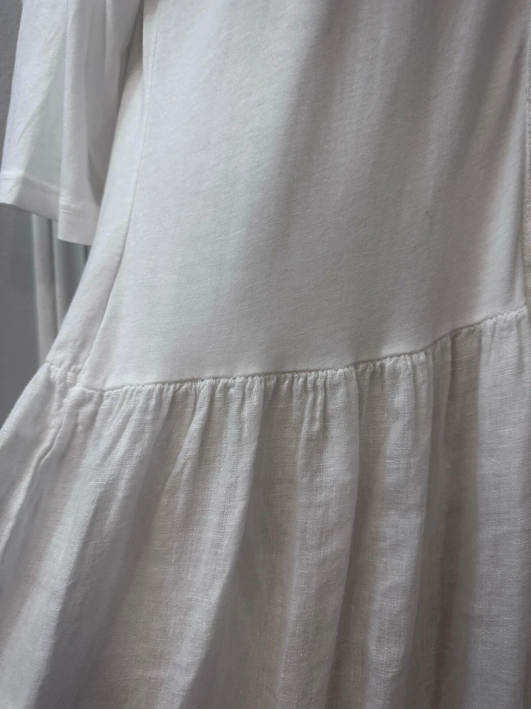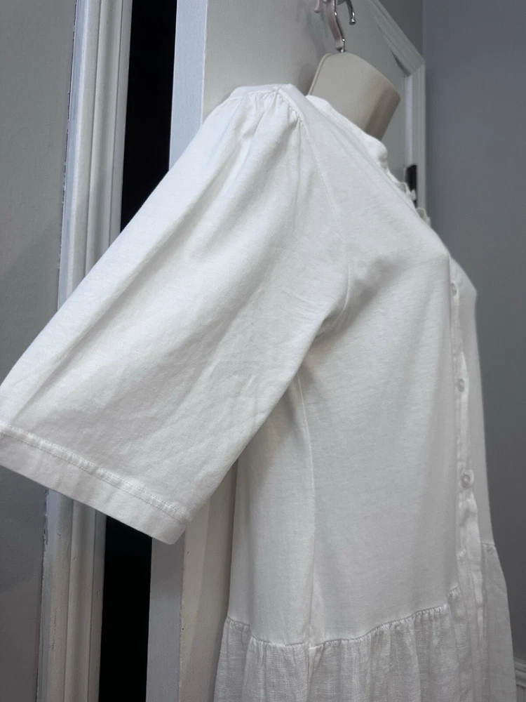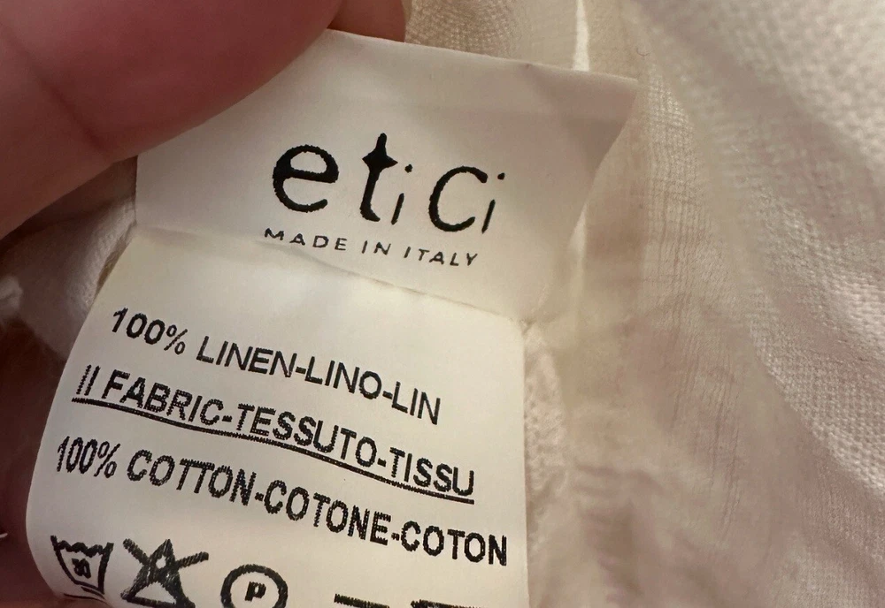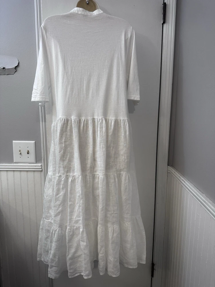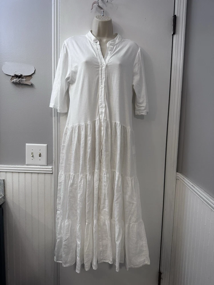 Perfect condition. Based on measurements it is size M/L. Please measure the pit to pit on another dress that fits you well to see if 17.5” is your size. This elegant Etici white linen maxi dress, crafted in Italy, is a timeless piece for any wardrobe. The dress features a button-front design, giving it a classic and versatile look. With a relaxed, tiered silhouette and 3/4 sleeves, it’s perfect for warm-weather occasions or layering with a cardigan for cooler days. Made from 100% linen, this dress offers a lightweight and breathable feel, ensuring comfort throughout the day. The high-quality Italian craftsmanship shines through in every detail, making it a chic choice for a casual day out or a special event. In excellent condition with no visible flaws. Etici dress, women’s white dress, linen maxi dress, button-front dress, Italian dress, tiered dress, summer dress, breathable dress, casual maxi dress, 3/4 sleeve dress, size L