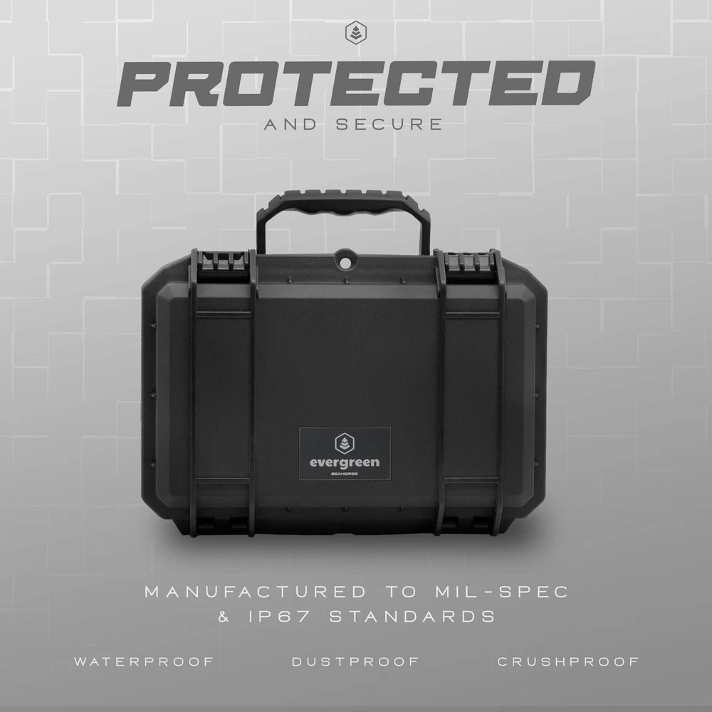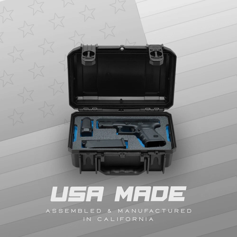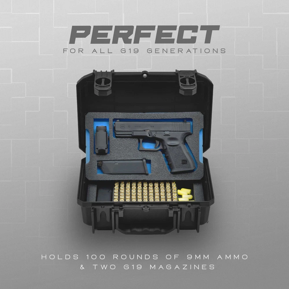 Designed for G19 - This insert was designed for a perfect fit for all G19 Generations Dimensions - (internal): 10.6" x 6.1" 4.0" inches (external ) 11.9" x 8.6" x 4.8" / weight 2.7 lbs. Easily fits in closets, under the bed, in drawers Ammo Storage - The bottom tray contains a custom cut insert that is designed to store 100 rounds of 9mm ammo as well as 2 x G19 magazines (Transporting firearms and ammo in the same case is not legal in California and New York) Waterproof, Moisture Proof, Crush Proof - Designed by Seahorse Cases, the SE230 protective case is manufactured to MIL-SPEC and IP67 Standards to ensure that your firearms and ammo will be protected and secure in any environment Safe and Secure Storage - The Evergreen G19 case was designed inside of the USA made Seahorse 230 Protective case for maximum security. This case includes 2 x Twist lock latches as well as a molded pad lock eyelet. Making this ideal for CCW USA MADE - All Evergreen X Seahorse Cases are designed and manufactured in Southern California Dimensions - (internal): 10.6" x 6.1" 4.0" inches (external ) 11.9" x 8.6" x 4.8" / weight 2.7 lbs. Easily fits in closets, under the bed, in drawers Lifetime Guarantee - You’ve invested in us and our case, so we’re also here to protect you and your investment. In our commitment to continue to support you, all of our cases have a lifetime guarantee