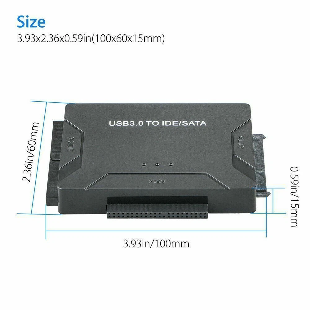 Product Features Get All Your Drives Active Combo's 3.0 to SATA IDE Converter allows you to connect 2.5"/3.5" IDE/SATA hard disks through USB port to the computer. This is a 2. perfect tool to duplicate, copy, backup or transfer large amounts of data from one drive to another. It has a SATA II connector and two IDE connectors (40pin and 44pin). Access to 3 Drives Simultaneously: This USB SATA adapter enables access to all three HDD drives simultaneously or file transfer among the 3 drives. It supports 2.5"/3.5" SATA HDD and SSD; 2.5"/3.5" IDE HDD; DVD-ROM, CD-ROM, CD-RW, DVD-RW, DVD + RW. Superb 5 Gbps Transfer: With USB 3.0 interface, data transfer rates up to 5 Gbps. The USB 3.0 interface is also backwards compatible with USB 2.0 / 1.1. Huge Capacity Supportive: Up to 4TB capacity of the drives supported. The LED indicator of the USB to SATA IDE adapter can monitor the working status. Plug and Play, easy to use. Wide Compatibility: This IDE SATA Adapter is universally compatible with Windows 10/ 8.1/ 8/ 7/Vista/XP, Mac OS 9/ 10, Linux etc. Supports drives with a capacity of up to 4TB. Support speed up to 5Gbps. Backward compatible with USB 2.0/1.1. On/Off Switch for HDD protection. Type Adapter/Converter Supported Drives 2.5"/3.5" SATA HDD/SSD; 2.5"/3.5" IDE HDD; DVD-ROM, CD-ROM, CD-RW, DVD-RW, DVD+RW Compatible Systems Windows8/7/10/Vista/XP/Mac OS 9/10/Linux Power Supply DC 5V/2A for 3.5" devices Features LED activity indicator, Plug & Play, reliable and stable Converter Size 3.93x2.36x0.59 in (100x60x15mm) Net Weight 8oz (226g) Package Weight 9.29oz (264g) Package includes: 1 x USB 3.0 to SATA/IDE converter 1 x USB 3.0 male to male cable 3ft 1 x 12V/2A (DC5.5*2.1) power cable 1 x 4pin Power Cable On Feb 28, 2024 at 02:43:13 PST, seller added the following information: