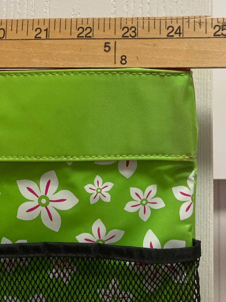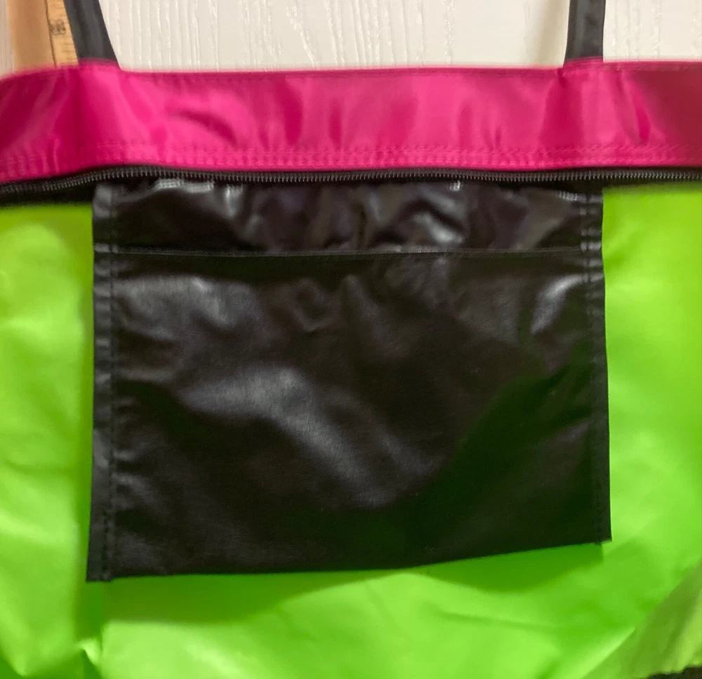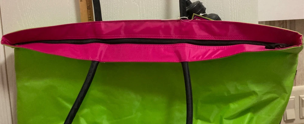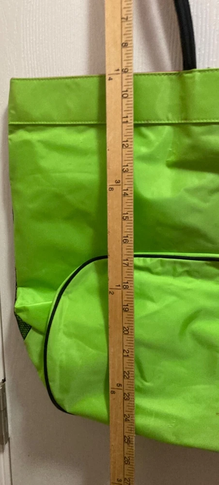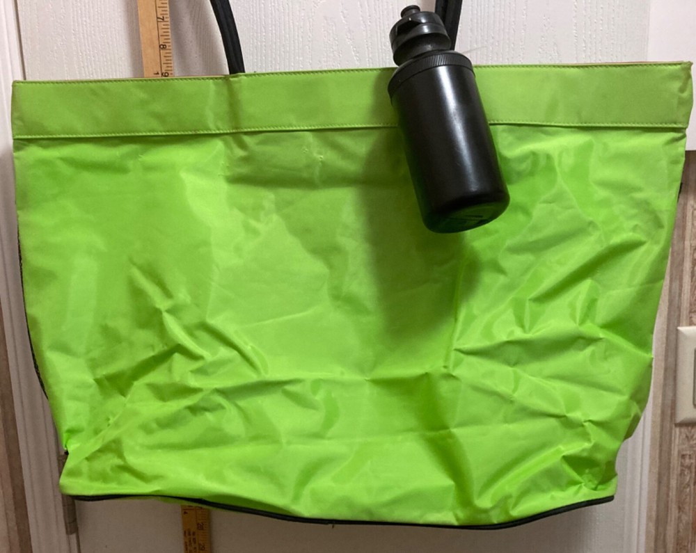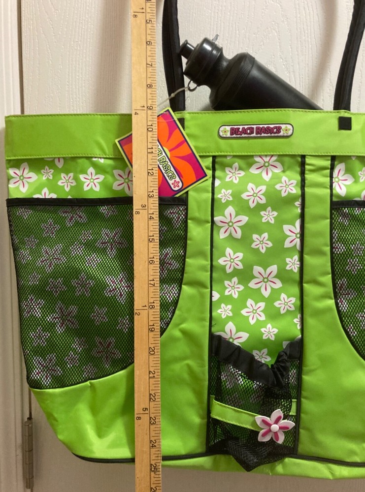 The product is an Extra Large Nylon Zippered Beach Bag in Green color with a black handle/strap. It is designed for women and includes a space for a water bottle. The dimensions are approximately 24 x 17 x 7 inches, making it spacious for carrying beach essentials. The brand associated with this bag is Beach Basics.