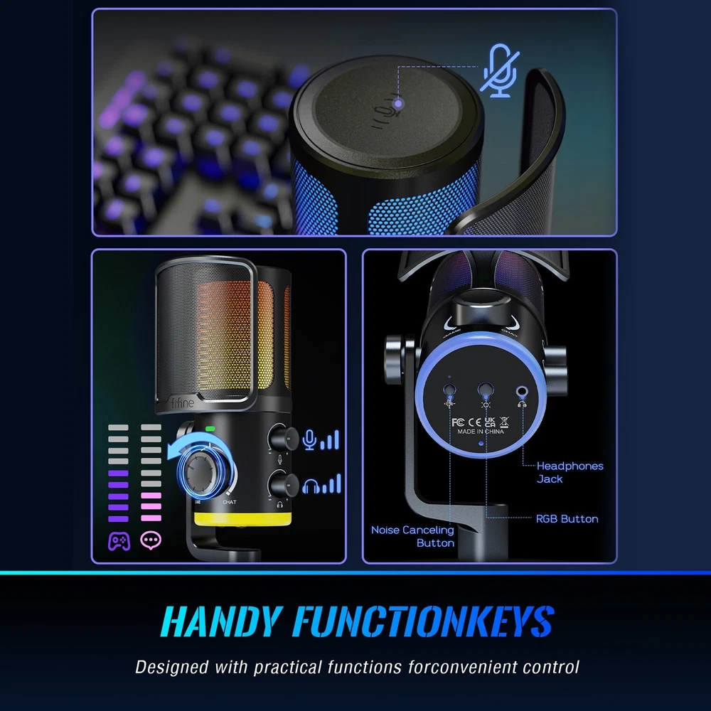 Features: [ Noise-Cancelling for Pure Sound ] Experience pristine audio with our advanced noise.cancelling technology. The condenser mic capsulecombined with a cardioid pickup pattern, deliverssmooth,high-sensitivity sound, capturing vocal nuanceswith remarkable clarity-even the softest whispers.Equipped with one-touch noise reduction technology, theFlFINE AM6 minimizes environmental noise,ensuring amore refined and detailed recording experience. [ Seamlessly Balance Game and Chat Volume ] Finding the perfect balance between game immersionand team communication has never been easier. Tired ofgame sound effects drowning out your teammatesvoices? With AM6, you're in control. Simply adjust theknob to GAME for full immersion in the captivating worldof game sound effects. Need to focus on teamwork? Switch it to CHAT, and your teammates' voices will comethrough crystal clear. [ Total Function Control with AM6 ] Equipped with a 3.5mm headphone jack, you can monitoryour audio in real-time, effortlessly adjusting mic andmonitor volumes with intuitive knobs. Plus, enjoy theconvenience of a touch-sensitive mute button located ontop, complete with an LED indicator for seamless controlover your audio experience. [ llluminate Your Gaming Space with Dazzling RGB Lighting ] The AM6 USB microphone boasts dual light effects withtop and bottom lighting design, adding an electrifyingambiance to your gaming setup. Control the vibrant RGBlights to elevate your gaming experience. The RGBlighting on the streaming mic complements your LED walllights and PC's dynamic colors, while the subtle RGBunderneath the mic harmonizes with your glowing mouseand keyboard. Transform your computer setup into avivid light show with AM6 microphone. You can long press and hold for 3 seconds to turn on or off RGB lighting without affecting the work of the mic. And short press to select 4 kinds of RGB mode and over 10 colors of RGB light. [ More Device Compatibility ] This USB microphone is compatible with Windows PCcomputer laptop, Mac, and PS4/5 that whether you'regaming or streaming, this microphone is the perfectcompanion. Warm Tips: 1. T his PC USB microphone is not compatible with Xbox, but works with desktop, laptop, PS4/PS5. Game/Chat balanced knob function is onlyapplicable to desktop, laptop or Mac, but unavailable for PS4/PS5. 2. Real-time monitoring is not activated by default on PC setup. Follow steps to activate real-time monitoring on PC. Click “Playback” tab from the Sound Panel-Double click “fifine Chat”-Levels-Click the speaker icon of microphone level to activate. 3. It is recommended to keep speaking to the top of this computer gaming microphone within 2-6 inches(5-15cm) to capture loud and clear sound quality, you have to turn the gain knob to a proper level before you use it. Specifications: Type: Condenser Polar Pattern: Cardioid Output Connection: USB Frequency Response: 70 -20 kHz Sensitivity: -42dB±3dB S/N Ratio: 75dB A+ Package included : 1 * Condenser Microphone with Pop Filter and Mic Based Stand 1* 6.5ft (2m) USB C to USB Cable 1* User's Manual Contact us : 1. If you have any questions please contact us by email, most emails are responded within 24 business hours. 2. Please send email directly or try send email by other account. The feedback forum is not the place to leave us a message. If you never hear from us please go to your "Inbox" under eBay "My Messages" section to look for our messages as we always send our messages directly through eBay to your email account and you can always find our messages there regardless of what email problems you may experience.
