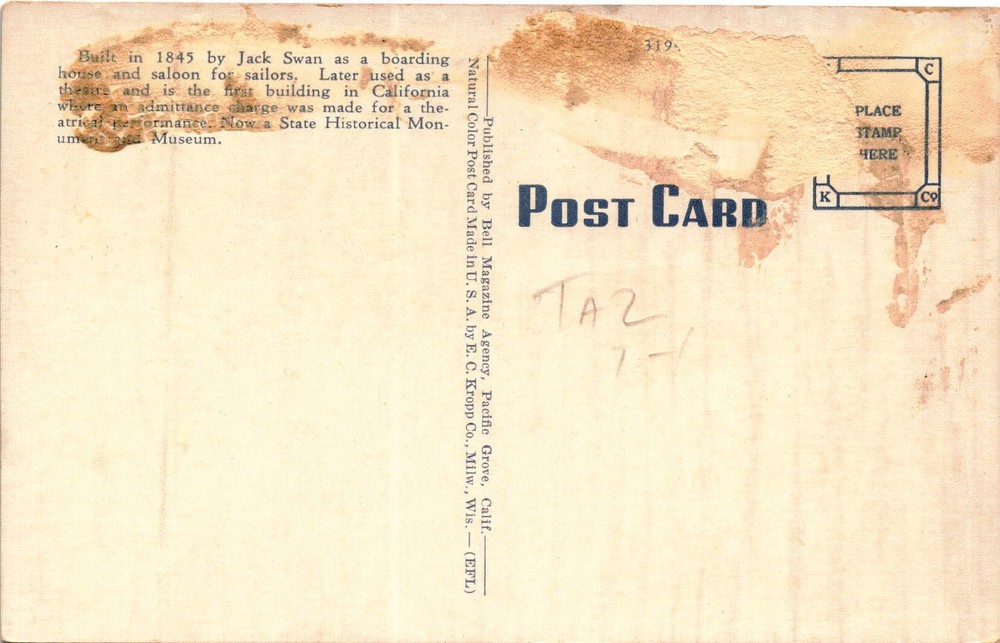 MAKE AN OFFER. THE MORE YOU BUY THE BETTER DEAL I WILL ACCEPT The First California Theatre in Monterey, California was built in 1845 by Jack Swan as a boarding house and saloon for sailors. It was later converted into a theater, becoming the first building in California to charge an admittance fee for a theatrical performance. The theater is now a State Historical Monument and Museum.