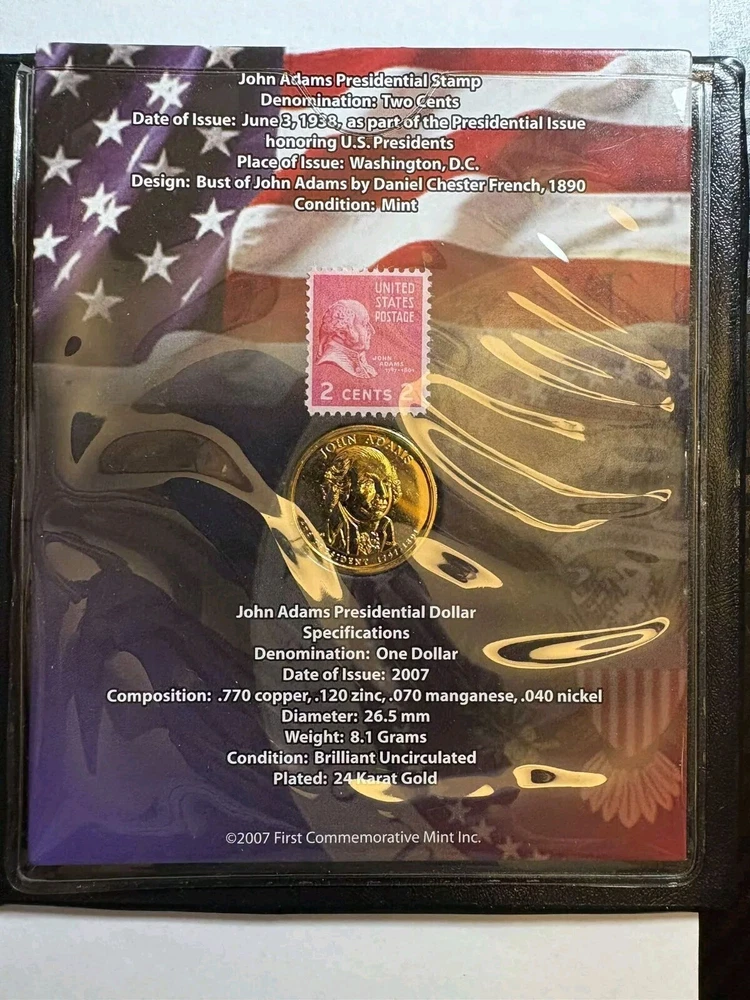 This commemorative mint features a beautiful Presidential Dollar and Stamp highlighting the legacy of John Adams. The coin is plated with 24 Karat Gold, adding a touch of elegance to this already impressive piece. The denomination of the coin is $1 and it was minted in 2007 in the United States. The coin is uncirculated and uncertified, making it a unique addition to any collection. The variety of the coin is John Adams and it is categorized under Coins & Paper Money, Coins: US, Dollars, and Presidential (2007-Now). This piece is a must-have for any coin enthusiast or history buff.