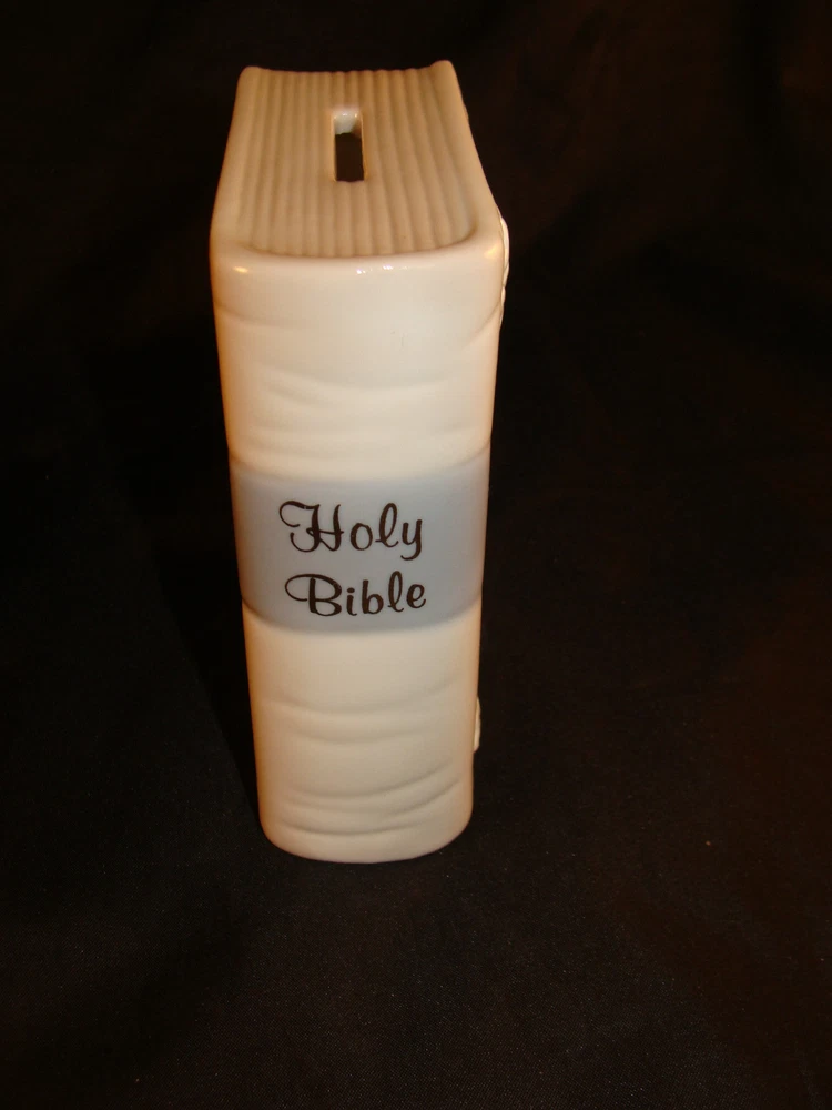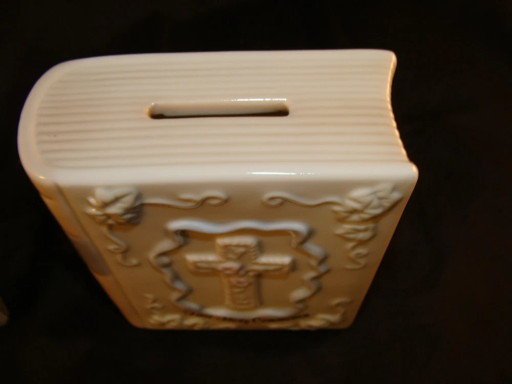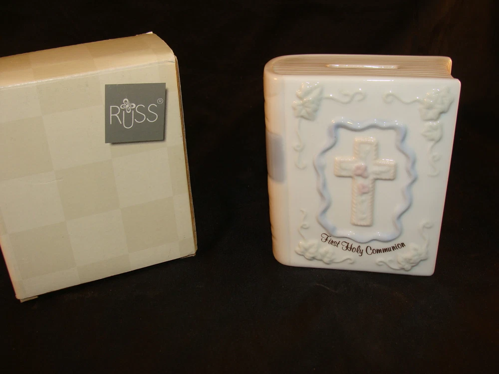 FIRST HOLY COMMUNION BOOK SAVINGS BANK. BY RUSS BERRIE & CO. Blue box like new original box no chips, cracks or crazing measures 5" Check out my other items ! Track Page Views With Auctiva's FREE Counter Add a map to your own listings. FREE Trial!