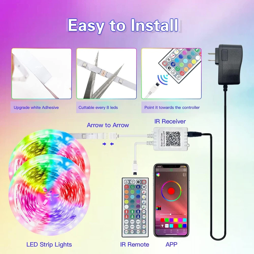 FONEWE 50ft Led Lights for Bedroom Strip 50FT, Multicolor Product Details Color: Multicolor Brand: FONEWE Indoor/Outdoor Usage: Indoor Special Feature: With the led lights it can create a romantic, gorgeous, interesting, magical atmosphere for your party and make your party time memorable. The led strip lights are allowed to adjust brightness and multiple colors. Dim the led light and set a favorite color, providing you a favorite atmosphere Light Source Type: LED Power Source: Corded Electric Light Color: RGB Theme: Holiday Occasion: Christmas, Halloween, Birthday, New Year, Party, Wedding Style: Modern Material: Plastic Controller Type: app,remote control Connectivity Protocol: Bluetooth Number of Light Sources: 450 Voltage: 24 Volts (DC) Wattage: 36 watts Included Components: LED light strip, power adapter, 4-key controller Item Weight: 5.9 Ounces Number of Items: 1 Item dimensions L x W x H: 7.87 x 8.66 x 8.66 inches Control Method: App Water Resistance Level: Not Water Resistant Wireless Communication Technology: Bluetooth Number of Batteries: 1 Lithium Ion batteries required. Manufacturer: FONEWE Part Number: FW5002 Item Weight: 5.9 ounces Product Dimensions: 7.87 x 8.66 x 8.66 inches Country of Origin: China Item model number: FONEWE-B-02 Batteries: 1 Lithium Ion batteries required. Assembled Height: 22 centimeters Assembled Length: 20 centimeters Assembled Width: 22 centimeters Maximum Compatible Wattage: 36 Watts Specific Uses: Led lights for bedroom with phone app control, super convenient. Special Features: With the led lights it can create a romantic, gorgeous, interesting, magical atmosphere for your party and make your party time memorable. The led strip lights are allowed to adjust brightness and multiple colors. Dim the led light and set a favorite color, providing you a favorite atmosphere Light Direction: Adjustable Batteries Included?: No Batteries Required?: No Average Life: 50000 Hours Product Dimensions : 7.87 x 8.66 x 8.66 inches; 5.9 ounces Item model number : FONEWE-B-02 Batteries : 1 Lithium Ion batteries required. Manufacturer : FONEWE Country of Origin : China Color: Multicolor Brand: FONEWE Indoor/Outdoor Usage: Indoor Special Feature: With the led lights it can create a romantic, gorgeous, interesting, magical atmosphere for your party and make your party time memorable. The led strip lights are allowed to adjust brightness and multiple colors. Dim the led light and set a favorite color, providing you a favorite atmosphere With the led lights it can create a romantic, gorgeous, interesting, magical atmosphere for your party and make your party time memorable. The led strip lights are allowed to adjust brightness and multiple colors. Dim the led light and set a favorite color, providing you a favorite atmosphereWith the led lights it can create a romantic, gorgeous, interesting, magical atmosphere for your party and make your party time memorable. The led strip lights are allowed to adjust brightness and multiple colors. Dim the led light and set a favorite color, providing you a favorite atmosphere See more Light Source Type: LED Power Source: Corded Electric Light Color: RGB Theme: Holiday Occasion: Christmas, Halloween, Birthday, New Year, Party, Wedding Style: Modern 【Extra Long LED Lights & Cuttable】 50ft led lights for bedroom provides enough length to decorate an entire room. You can use the led strip lights for bedroom, living room, kitchens, staircases, cabinets, bedframes etc. to make your whole home vibrant. These lights for bedroom can be easily cut and linked with other led light strips to get your desired length, which can be cut along the cutting marks.It is suitable for holiday parties,like Christmas,Halloween, etc. 【Smart App & 4 Key Controller】 Our led light strips support both phone App and 4-key controller which allow you to change the led lights color and modes very conveniently. You can freely choose 16 million colors, multiple scene modes, brightness adjustment, timer, music sync etc. by the App or remote control. Adjustable brightness and multiple lighting modes to fit room mood. 【Cool Music Sync with the lights】The Led Strip lights has a built-in sensitive microphone, allowing the led lights changing colors according to the rhythm of your favorite musics or surrouding sound, and creating romance, relaxation, gorgeous and interesting atmosphere for your party. 【Very Simple Installation with Upgraded Strong Self-Adhesive】We provide the strong self-adhesive tape, controller and power adaptor to install the led lights strip, no need other devices. The self-adhesive tape makes it easy to stick on clean and dry surface. Just follow the instructions on manual and you can set up the lights in minutes. Note: it's NOT waterproof and is indoor use only. 【Timing Function&Adjustable Brightness】These led lights have a smart timer mode. With the smart application, presetting the appropriate time and suitable color to make it turn on /off automatically. You can customize the brightness you prefer to create your ambience. The led lights can remember the last settings so that you don't have to set repeatedly.