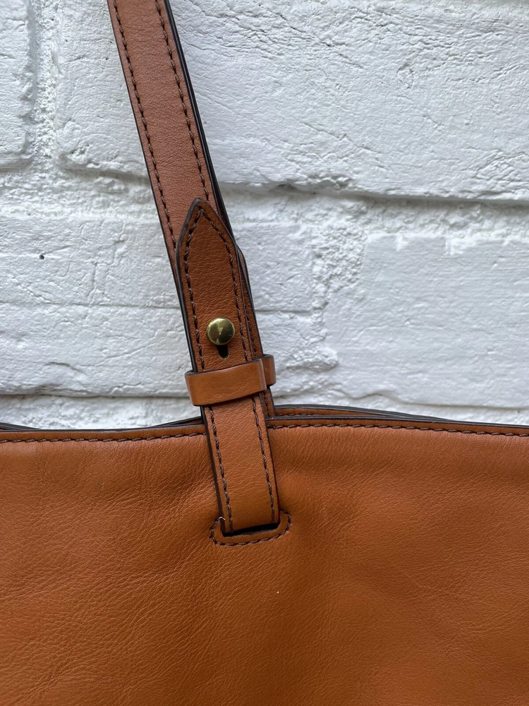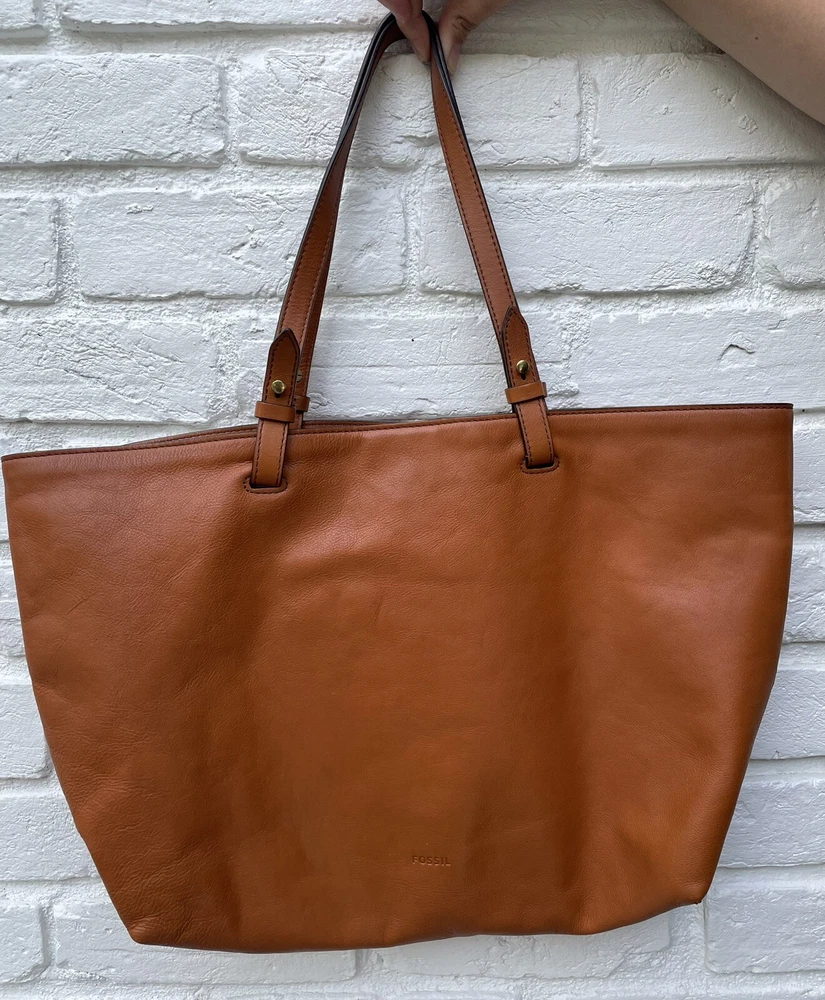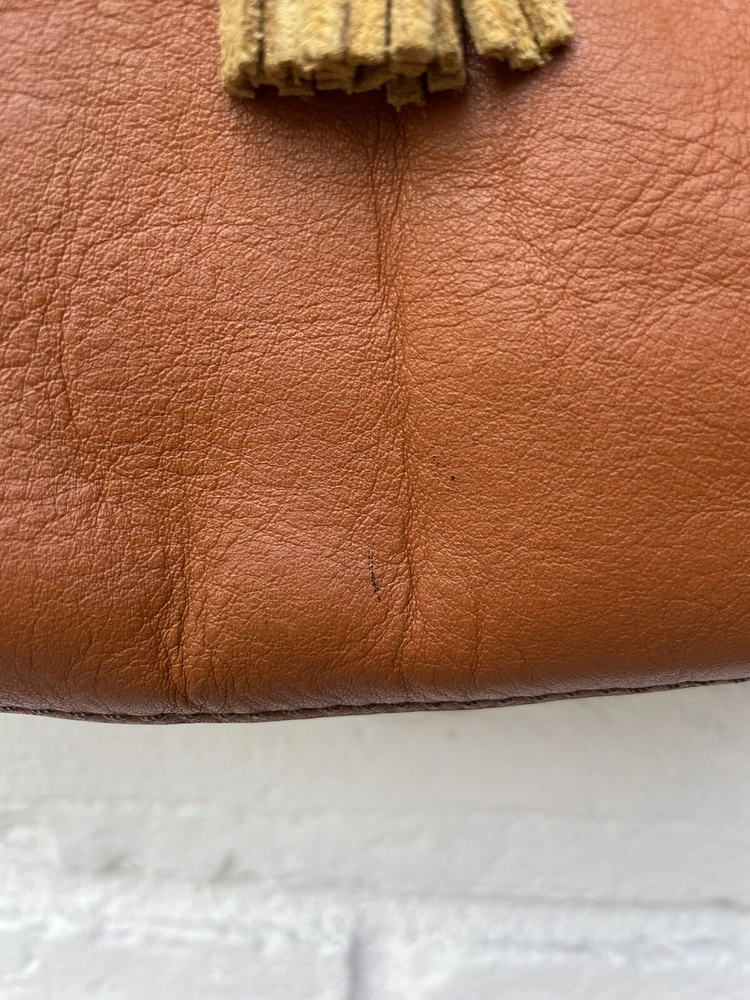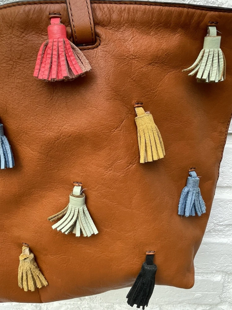 Pre-owned FOSSIL Leather Tote Bag Purse Brown Multi Colored Tassels EUC RARE! Very Nice!. Tan leather exterior with brass toned hardware and multicolored leather tassels. Denim blue lining. 1 zipper and 2 slip pockets. Double leather straps w/ drop of 9". Magnetic closure. 13"L across the base, 17.5"L across the top x 10.5"H x 4.25"D Has extremely minor marks on the side, shown in last two photos. Overall, it shows minimal signs of use, is very clean, and in well cared for condition. Please feel free to contact us with any questions or concerns you may have regarding our active or completed listings. We will do our best to provide you with the information you are looking for. Please send all communication via the eBay messaging system. New items will state they are new in the listing. If you are unhappy with your new item, you may return the item in its original packaging for a refund. Item must be received by us before a refund will be issued. Return shipping will be at the buyer's expense and is not refundable. Unless otherwise stated, All items being sold from our eBay page should be considered pre-owned or second-hand. Please read the description and look at each photo carefully. If an item has a defect or an issue with condition, we will do our best to describe it and it will be noted in the description and/or photos. Items may need ironed/steamed as wrinkling may occur in storage or shipping. We will only ship to the address the buyer has registered with eBay Customer service is our top priority. If you make a purchase from us and an issue arises; please give us a chance to make things right by contacting us before leaving negative feedback or opening a case. We promise to resolve problems quickly and professionally. Thanks so much! South Shiloh
