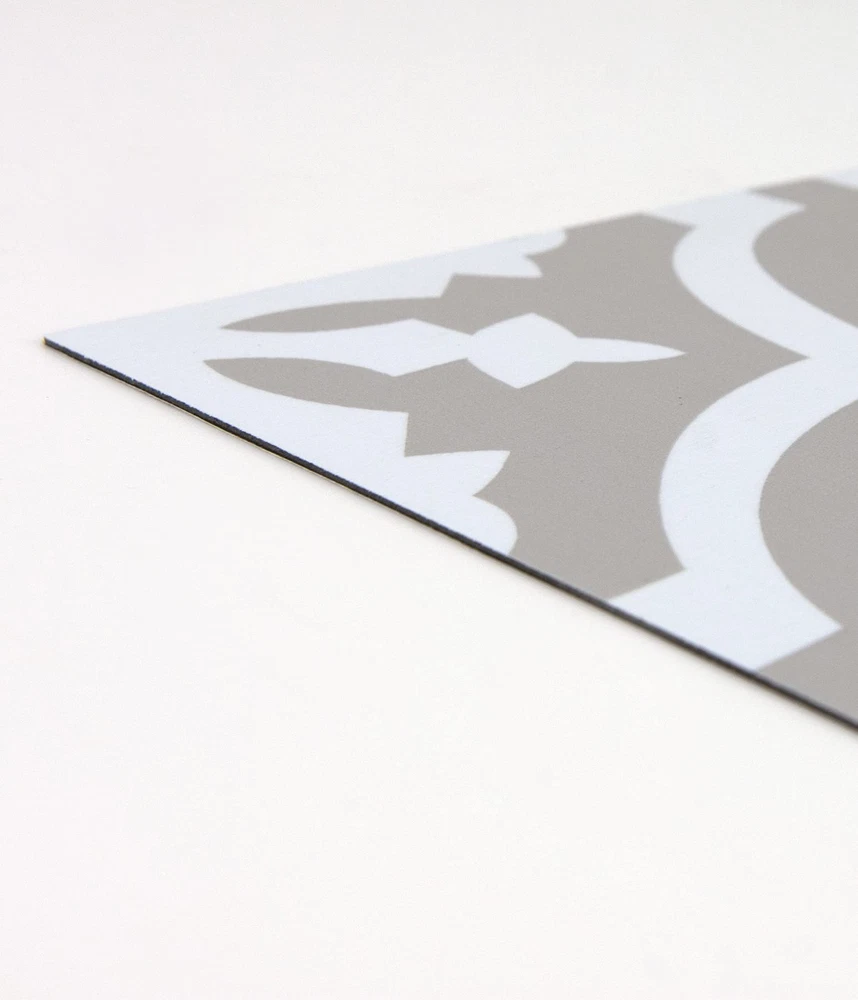 Grey and white peel and stick floor tile with a farmhouse style Peel and stick to apply Easy installation - no grout or special tools needed Water resistant and washable Virgin Vinyl material with a textured low lustre finish and permanent adhesive makes tiles durable One package contains 10 tiles that each measure .06-in in depth Each tile measures 12 x 12 inches