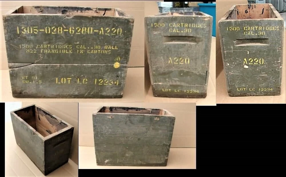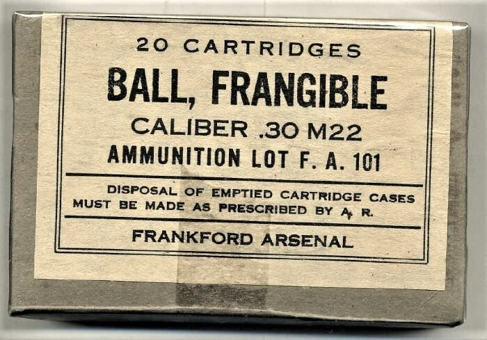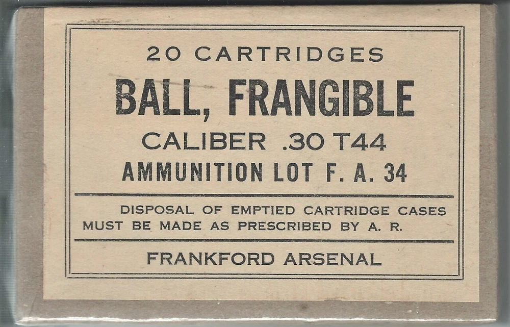 *NOTE TO EBAY - THESE BOXES ARE EMPTY AND DO NOT CONTAIN ANY RESTRICTED AMMUNITION COMPONENTS* Up for your consideration is a set of two empty reproduction CALIBER .30 T44 BALL FRANGIBLE 20 round ammunition cartons with a FRANKFORD ARSENAL label. The Frangible-type round grew out of a request from the Army Air Forces for a special type of ammunition that could be used in advanced gunnery training. This request resulted in the development of a .30 caliber round that had a bullet made of a lead powder and bakelite combination, fired from a modified machine gun at an armored P-63 Kingcobra aircraft. The training program began in mid-1944 at all of the aerial gunnery schools and was known as "Operation Pinball". The initial production of the T44-designated round was undertaken by Frankford Arsenal and Western Cartridge Company in the summer of 1944, followed by St. Louis and Lake City Ordnance Plants. Later, in the spring of 1945, with the increased demand for the frangible round, production was started at the Twin Cities and Des Moines Ordnance Plants. Also at this time, the T44 was adopted as the M22, with production ending in the fall of 1945. Each "Buy It Now" single purchase is for 2 unassembled cartons with dividers and FRANKFORD ARSENAL T44 BALL FRANGIBLE label, with a lot number matching my original. The cartons, dividers, and labels will be shipped flat, with assembly instructions. I had a lot of these made, so if you want multiple sets, just change the auction quantity before you click the "Buy It Now" button. Check my feedback and buy with confidence. I prefer paypal, and shipping is free to U.S. buyers. I will ship world-wide, with the buyer paying all shipping charges. Those charges will be added by eBay during the checkout process. I will combine shipping for multiple items if you ask. Be sure to check out all my other replicas. Just click on my store link at the bottom of this listing. Thanks for looking, and I appreciate your business.