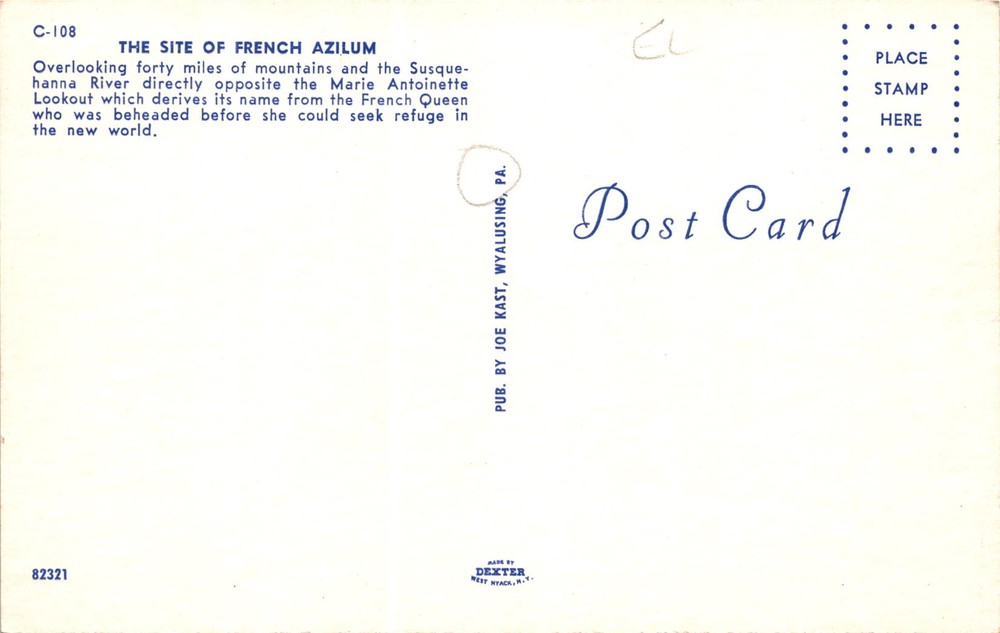 MAKE AN OFFER. THE MORE YOU BUY THE BETTER DEAL I WILL ACCEPT This postcard features the site of French Azilum, located in Wyalusing, Pennsylvania. French Azilum was a planned settlement created in 1793 to provide refuge for French aristocrats fleeing the French Revolution. The settlement overlooked forty miles of mountains and the Susquehanna River.
