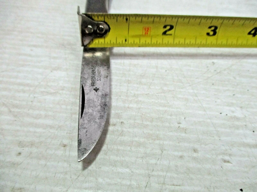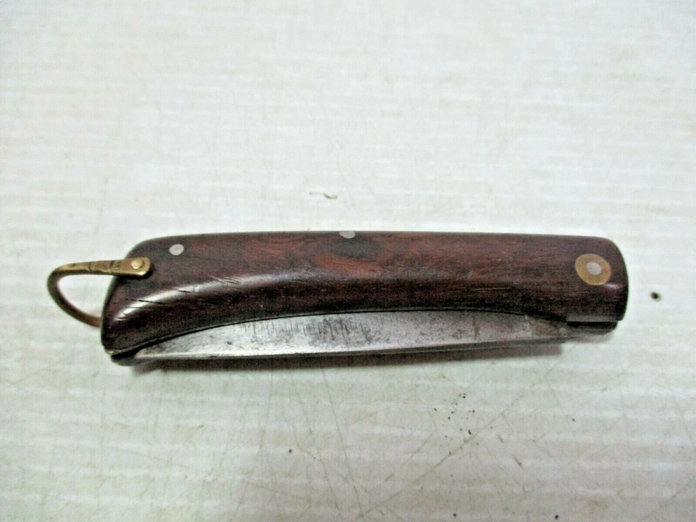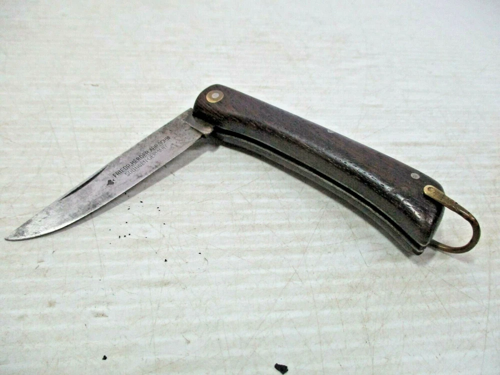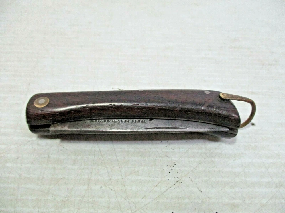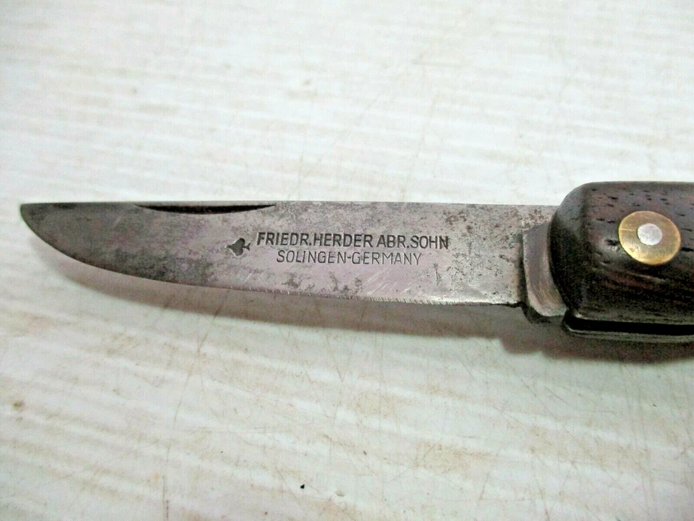 Up for sale is a FRIEDR.HERDER ABR.SOHN Solingen Germany Folding Wood Handle Pocket Knife / Bail. The blade is clearly marked " FRIEDR.HERDER ABR.SOHN Solingen Germany". It has a gold colored metal bail on the end. The approximate measurements are shown in the photos 6 1/2" open and blade is 3" long x 5/8" at widest to 1/2" towards the tip at the end. This is in good condition. There are no chips or splinters in the wooden handle. The bail on the end is attached solidly. The rivets all look good. The blade has some stains and some scratches and needs sharpening. There are many small scratches on the blade the side opposite of the markings. It is clearly marked. It opens easily and closes with a snap. (Please see photos) I am not an expert or dealer, only try to describe item to the best of my ability. Please see photos and email with any questions. D3