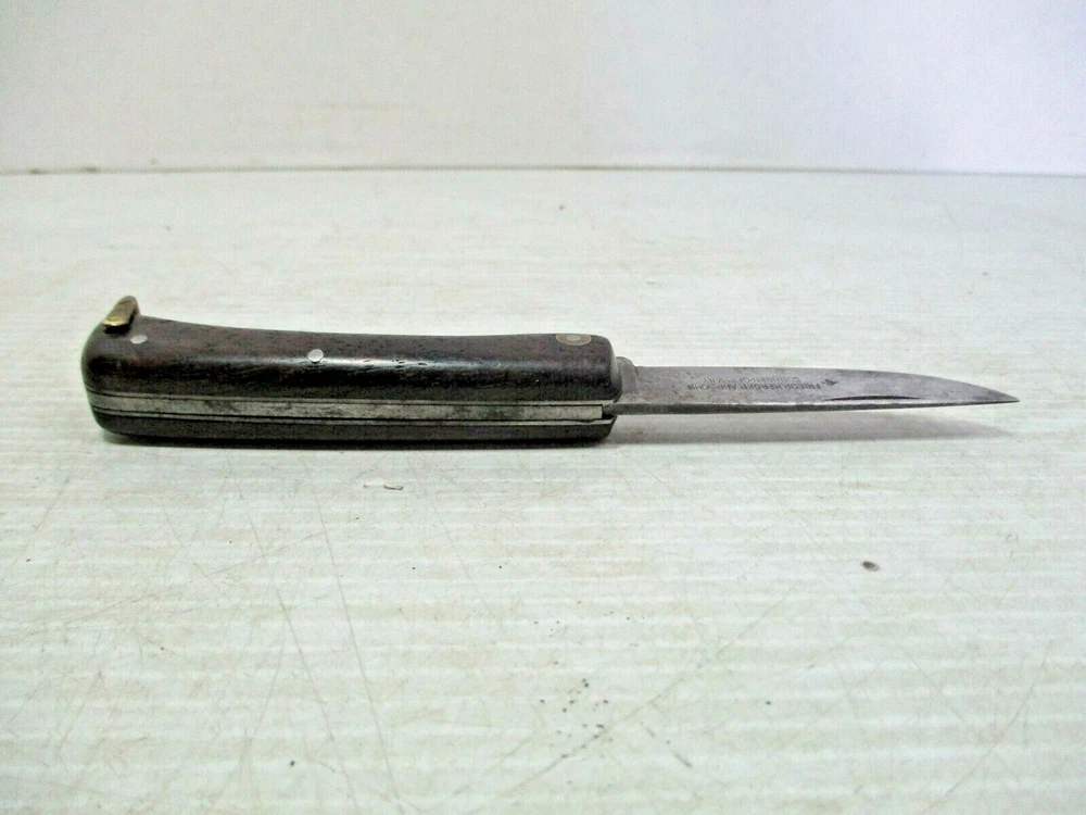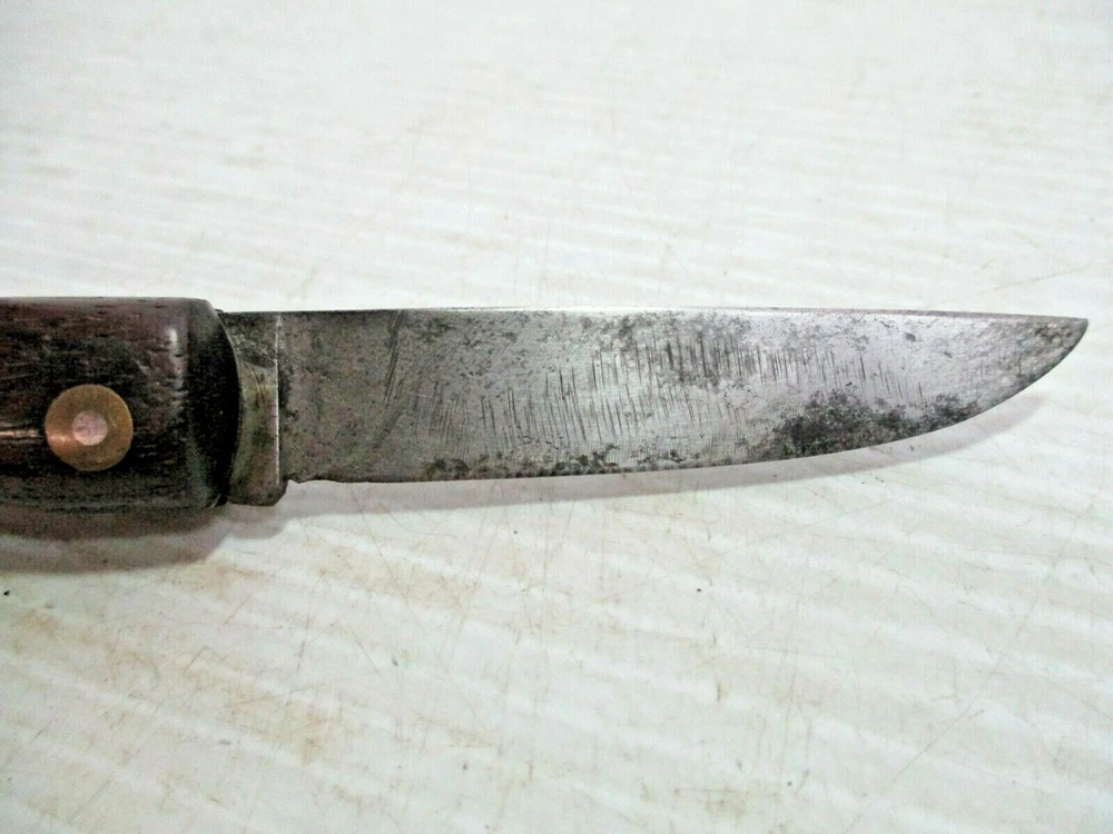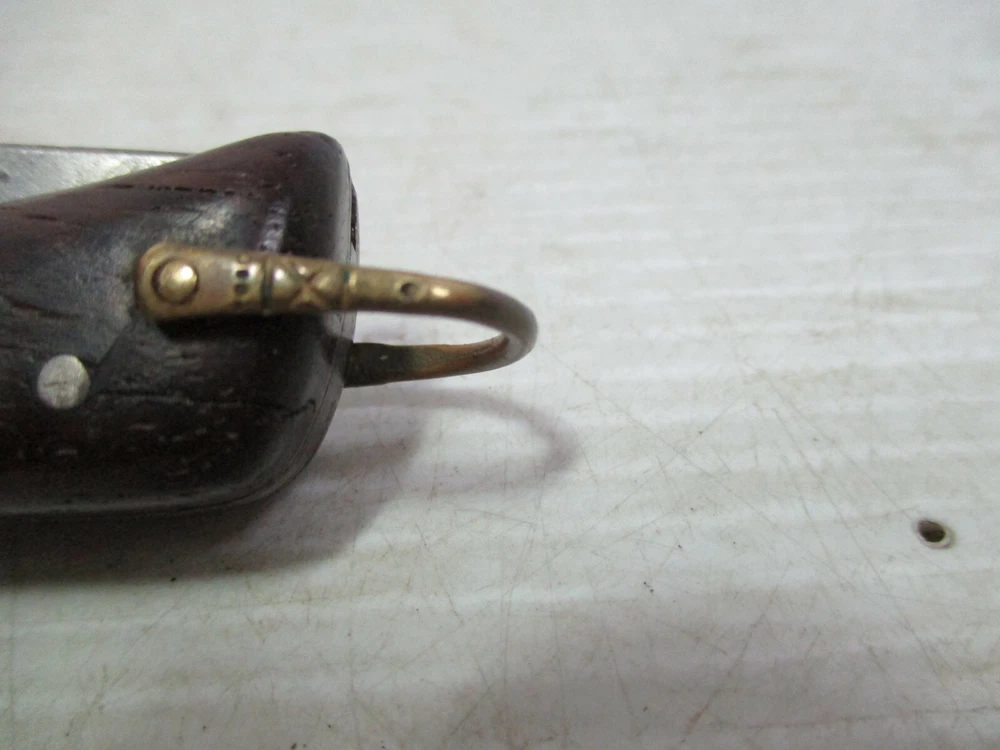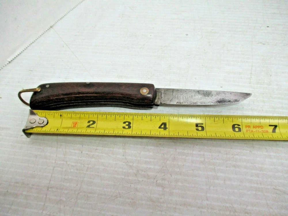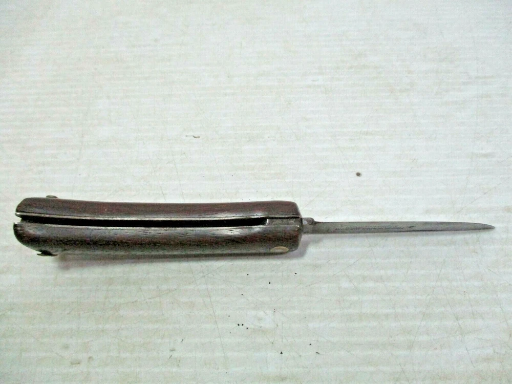 Up for sale is a FRIEDR.HERDER ABR.SOHN Solingen Germany Folding Wood Handle Pocket Knife / Bail. The blade is clearly marked " FRIEDR.HERDER ABR.SOHN Solingen Germany". It has a gold colored metal bail on the end. The approximate measurements are shown in the photos 6 1/2" open and blade is 3" long x 5/8" at widest to 1/2" towards the tip at the end. This is in good condition. There are no chips or splinters in the wooden handle. The bail on the end is attached solidly. The rivets all look good. The blade has some stains and some scratches and needs sharpening. There are many small scratches on the blade the side opposite of the markings. It is clearly marked. It opens easily and closes with a snap. (Please see photos) I am not an expert or dealer, only try to describe item to the best of my ability. Please see photos and email with any questions. D3