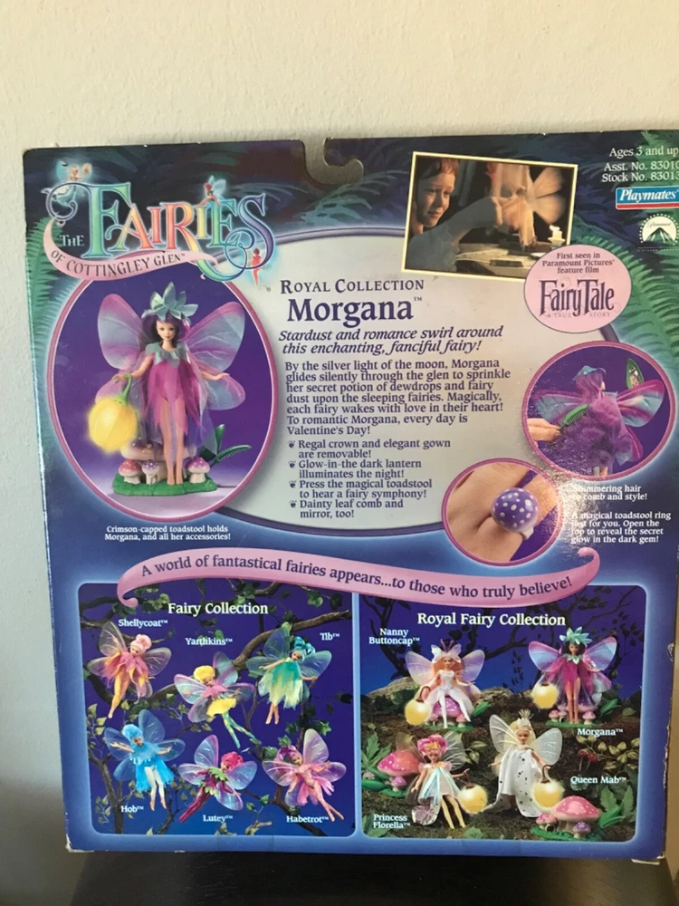 This Princess Florella doll from the Royal Collection of the Fairies of Cottingley Glen is a perfect addition to any vintage doll collection. With her purple hair and blue eyes, she is a stunning 6-inch figure made of vinyl and plastic. The doll comes with a set of 5 pieces and is an original, licensed reproduction from Playmates Toys. This figure is part of the playmate toys product line and is perfect for collectors or for children who love fairies. The doll's complexion is light, and she is dressed in a beautiful gown fit for a princess. This is a must-have item for anyone who loves vintage dolls or the Fairies of Cottingley Glen franchise. The toadstool still plays it’s enchanting melody!