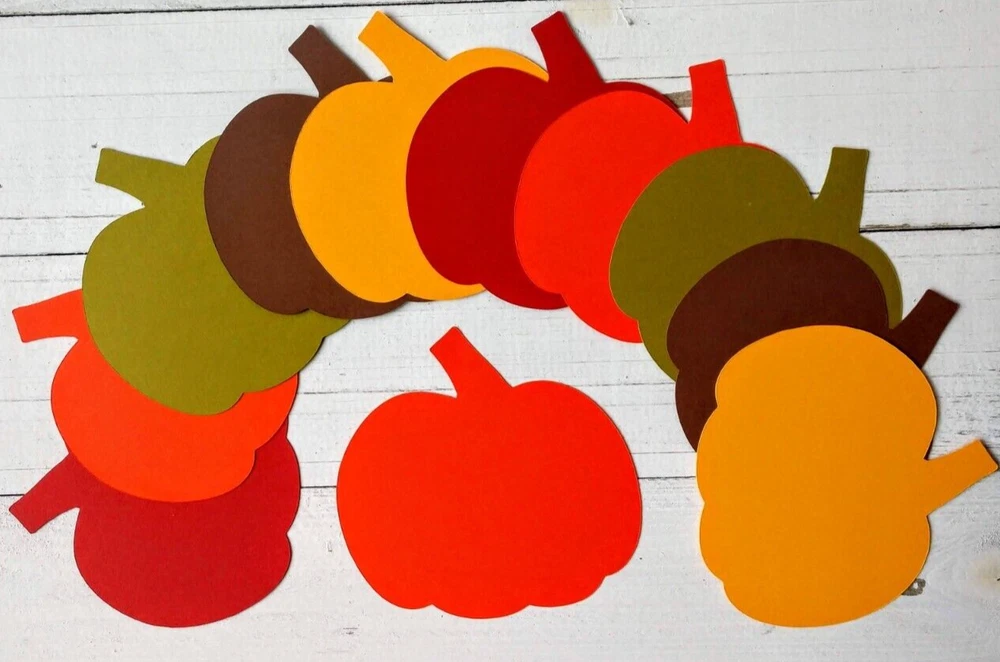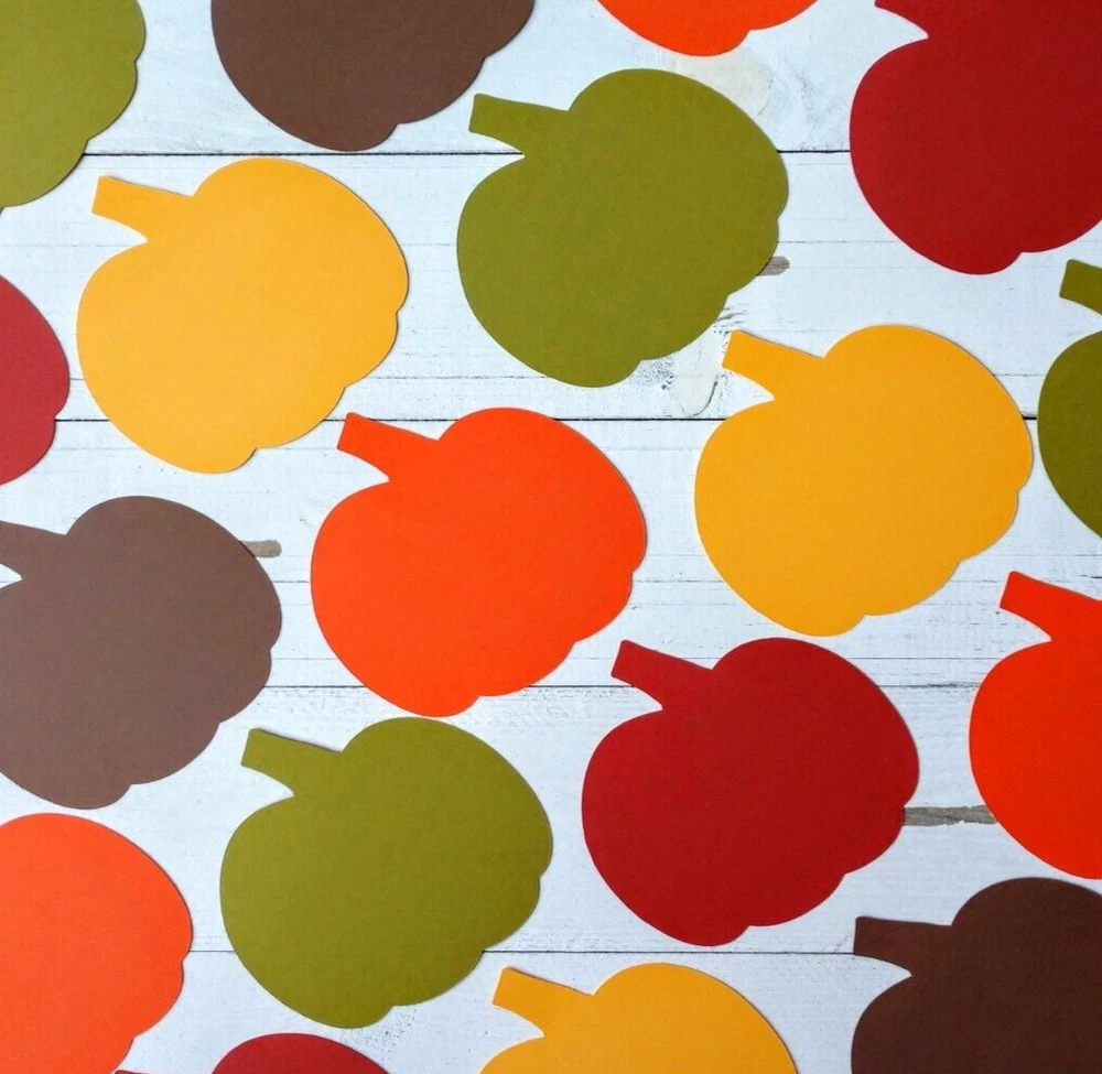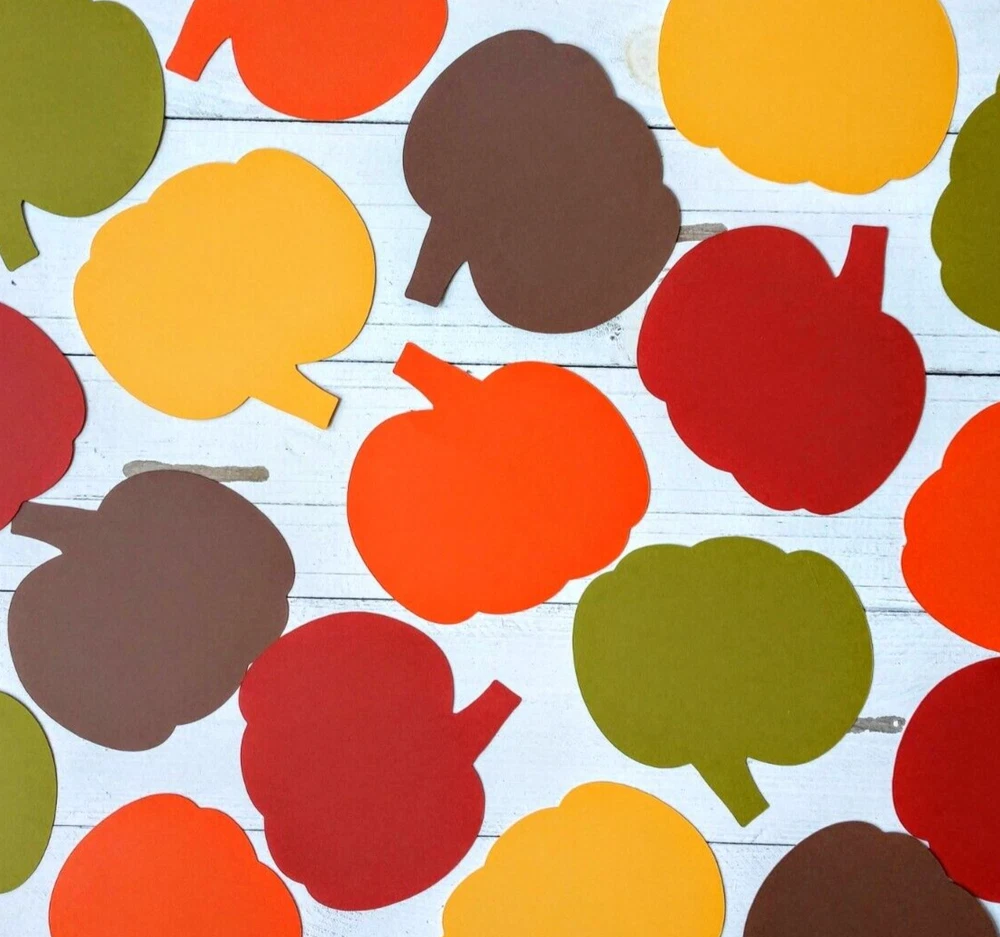 These fall pumpkin die cuts are perfect for autumn themed birthday parties, baby showers, bridal showers, cookouts, holiday celebrations and more. Use for table decorations, banners, posters, scrapbooking, card making, and craft projects. Set includes 10 pumpkin die cuts, 2 in each of the following colors: Brown, Orange, Yellow, Olive & Red. Pumpkin size is 3 1/2" x 3 1/2".