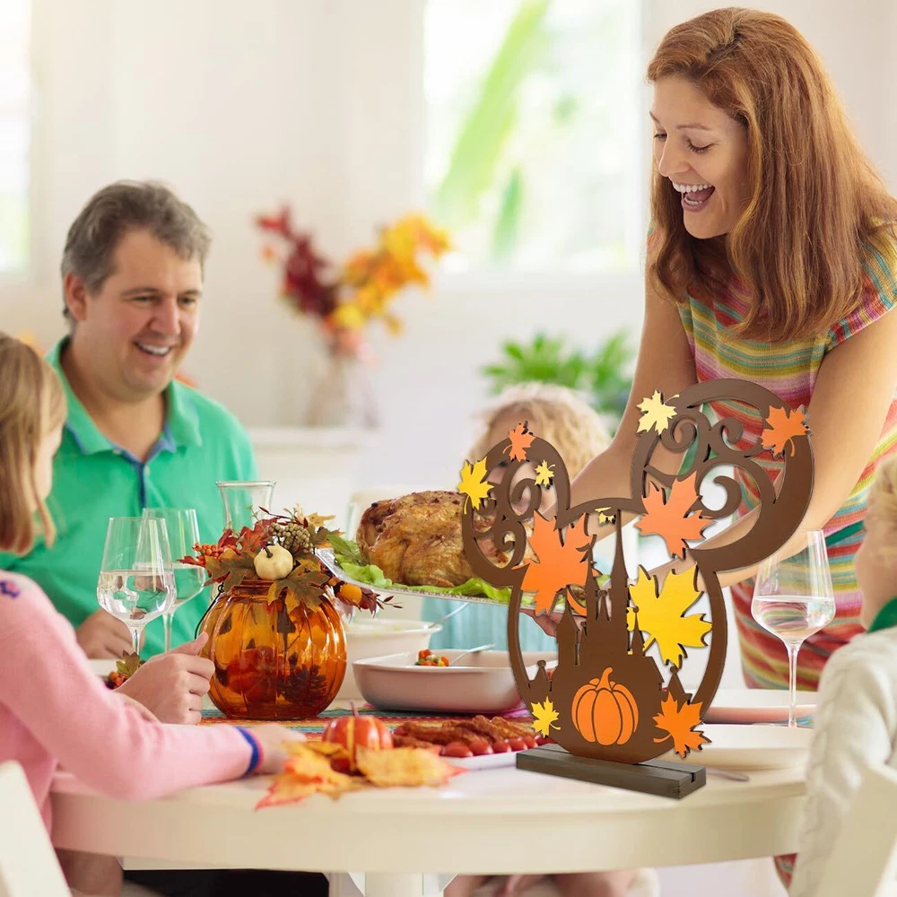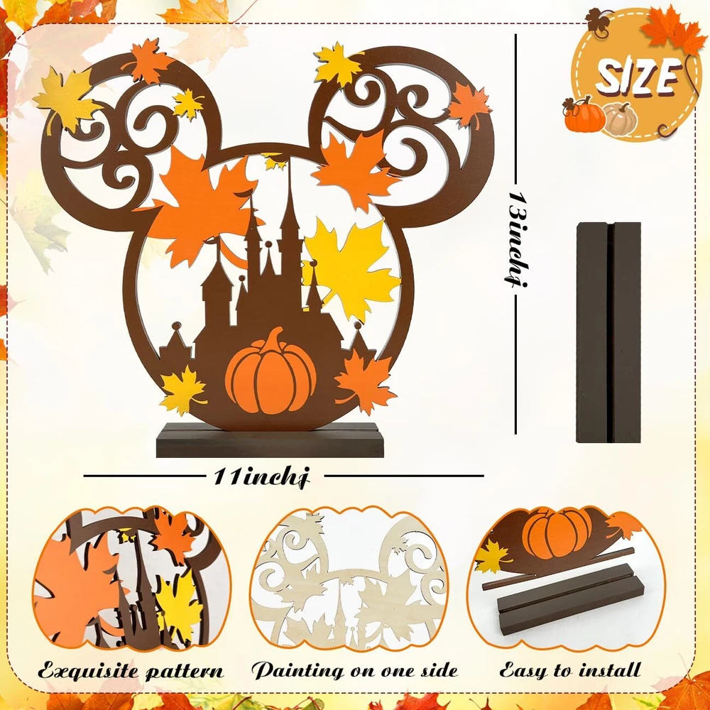 Bring the warmth and charm of autumn into your home with these delightful Happy Fall Table Decoration Signs. Crafted from natural wood, these Thanksgiving centerpieces feature adorable mouse figurines perched atop, adding a whimsical touch to your festive table setting. The intricate carved details, including a Disney Mic-key Mouse-inspired pumpkin head surrounded by vibrant fall leaves, capture the essence of the harvest season. Whether you're hosting a Thanksgiving feast or simply embracing the cozy ambiance of autumn, these table toppers will become a cherished part of your holiday decor. Measuring approximately 13 inches in height, they're the perfect size to create a focal point on your dining table or sideboard. Celebrate the beauty of fall with these charming and unique decorative pieces. Hall Fall Table Topper: Measuring approximately 13 inches in height, they're the perfect size to create a focal point on your dining table or sideboard. Fall wooden table toppers featuring a cute mouse design, perfect for Fall and Thanksgiving decorations. Thanksgiving Indoor Decorations: This Thankgiving mouse wooden sign create a charming centerpiece or scatter around the table. Happy Fall Table Decoration Signs: Crafted with warm colors and leaf motifs, capturing the essence of the harvest season. Harvest Party Table Centerpiece : Made from high-quality wood for long-lasting use and easy storage year after year. Multipurpose Ornaments: Mouse wood decorations can also be used as decorative accents for Halloween, Christmas, or Harvest seasonal decor.