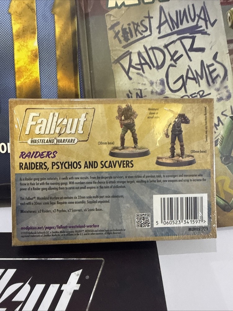 The product is a sealed set of miniatures for the game Fallout Wasteland Warfare, featuring Raiders, Scavengers, and Psychos. Produced by Modiphius, these miniatures are designed for players aged 12-16 years old to use in their gameplay. Perfect for fans of the Fallout universe and collectors of miniature figures, this set allows players to add to their arsenal of characters and enhance their gaming experience with detailed and unique figures. Sealed NIB