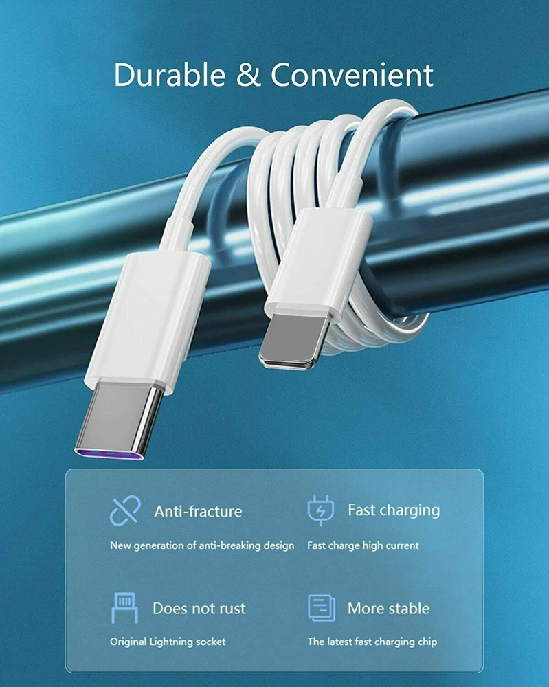 • MFi Certified to ensure flawless compatibility with iPhone, iPad Series with connector. • 3 FT/6FT for iPhone charging cable, perfect for office/ business/ home use. • For iPhone Fast Charger can charge the iPhone 12 Pro up to 60% in 30mins with the 20W PD wall charger. • Excellent copper wire ensures the safety of the device duri ng charging, specifically designed for fast charging. Compatible Devices: For iPhone 14 Pro Max, For iPhone 14 Pro, For iPhone 14 Plus,For iPhone 14, For iPhone 13 Pro Max, For iPhone 13 Pro, For iPhone 13 Mini,For iPhone 13, For iPhone 12 Pro Max, For iPhone 12 Pro,For iPhone 12 Mini,For iPhone 12,For iPhone 11, For iPhone 8, For iPhone 7 plus, For iPhone SE, For iPhone 6s plus, For iPhone 8 plus, For iPhone 5c, For iPhone 5s, For iPad Pro, For iPad For Air, For Air 2, For iPad mini, For mini 2, For mini 4, For iPod Touch, For iPod Nano 7th gen Color:White Cable length: 3 FT/6FT Package Included: 1/3/5/10/20/50/100x USB-C To iPhone PD Cable