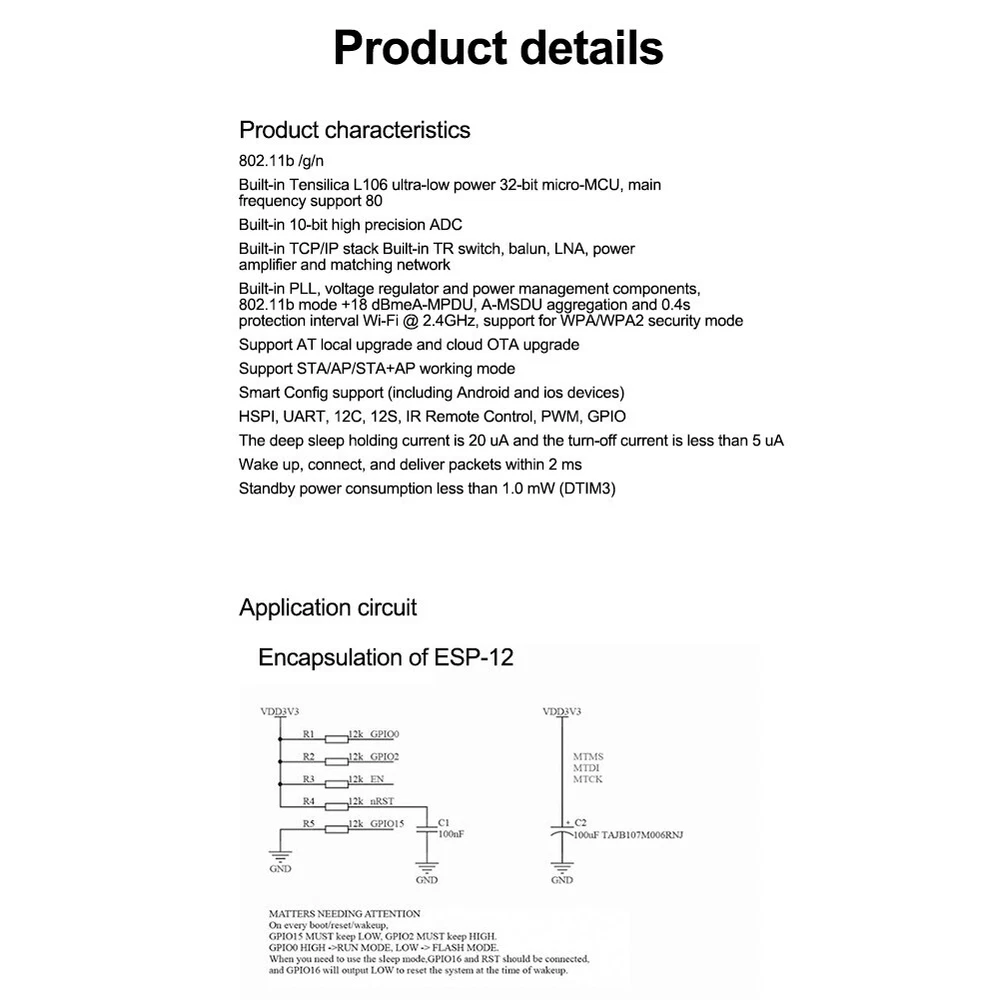 Fast and Efficient Wifi Module for IoT Development For CH340 For ESP12F DESCRIPTION Features: * for ESP8266 Serial Wifi Module: A powerful controller(for ESP-12F) with 802.11 b/g/n connectivity, enabling seamless wireless communication. *Compact Design: With dimensions measuring 58 x 31 x 13 millimeters, it offers a small and space-saving solution for IoT development. *High-Performance Features: Equipped with a for Tensilica L106 ultra-low power 32-bit MCU, supporting a clock speed of 80 for fast and efficient processing. It also includes a 10-bit high-precision ADC for accurate analog-to-digital conversion. *Comprehensive Built-in Components: It comes with a TCPIP protocol stack, TR switch, balun, for LNA and matching network, providing enhanced capabilities for seamless connectivity and performance. *Versatile Functionality: Supports various modes including STA, AP, and STA+AP, with Smart Config function for easy setup. Additionally, it enables local and cloud OTA upgrades for convenient firmware updates. Specifications: *Part Name: for ESP8266 Wifi Module For Lua V3 Development Board For CH340 for ESP-12F *Material:PCB *Size:58 x 31 x 13 millimeters *Color:As shown Package Content: 1* for ESP8266( for ESP-12F )Development Board Note: 1. The real color of the item may be slightly different from the pictures shown on website caused by many factors such as brightness of your monitor and light brightness. 2. Please allow slight manual measurement deviation for the data. POLICES Shipping Payment WARRANTY We only ship to confirmed ebay Order addresses. Please comfirm that your Order address is in line with your shipping address. Please kindly note that the c ombined shipping is not provided because the shipping fee is calculated by weight. Also, the each additional item means exactly the the same color and size. It takes about 7 -15 working days to US; about 10-30 working days to other countries. Transit time may be a little delayed because of the bad weather and customs inspection . If you do not receive your item within 30 working days since payment finished, please contact us immediately for further assistance. Payment must be completed within 5 days. If you have any problems about payment, please contact us via ebay message. We strive for 100% customer satisfaction! Positive Feedback is very important to us. If you have any questions, p lease feel free to contact us via "Ask seller a question" . We will reply your email within 24 working hours.