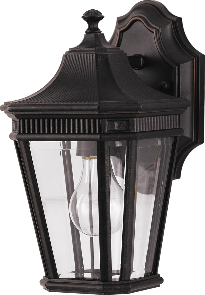 With their great accents, beautiful countryside and ability to sound exceedingly polite even when theyre insulting you, theres a lot to envy about the English. Fortunately, theres also an easy way to steal a smidge of their admirable style with the Cotswold Lane outdoor wall lantern from Feiss. Designed to resemble a lantern from 18th century England, this handsome sconce features an elegantly shaped backplate and roof with a fancy little finial on top. Its clear beveled glass lets the light inside shine brightly and provides the perfect opportunity for you to enhance the antique appeal by using an Edison style bulb. Made from aluminum, the Cotswold Lane wall lantern is rated for wet areas so, just like the English, it can endure immeasurable amounts of rain. Lights Online