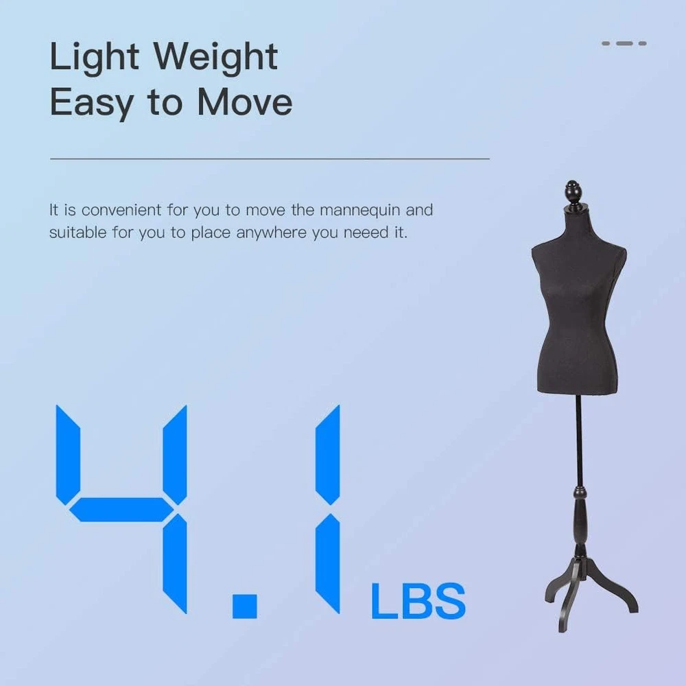 VARIETY OF DISPLAY:The mannequin can display your products in a window, on a counter, on a tiered display shelf, or on the floor.The dress form Ideal for sweaters, T-shirts, jackets, dresses, blouses, tops and accessories. HEIGHT ADJUSTABLE:This mannequin has an adjustable knob,mannequin torso height can be adjusted 60-67 inches. Turn the knob to find the height of the dress form that suits you. The manikin can work well with you. THE STANDARD MODEL BODY:The dress model has the perfect figure,The dimensions of mannequin each part:chest 34.6'';shoulder15.75"; waist 25.6"; hips 33.8";Neck 12.5'', the dress form is great for widowshop displays, photography and home decor. EASY TO SETUP: The dress form is very lightweight and easy to move.With the installation instruction enclosed in the mannequin torso product package, you can complete the assemble or disassemble manikin in minutes without any tools. CLEAN AND TIDY FABRIC: The surface of the mannequin is covered by clean and tidy fabric, stretchable cotton cover perfectly attached to the mannequin torso body, We will remove inferior dress form with glue. The adjustable mannequin for sewing features torso, stainless steel tube and wooden tripod - functional but graceful model to display your clothes.Mannequin stretched-cotton jersey cover feels soft and comfortable; the combination of stainless tube and wooden base ensures its stability while it can support heavy clothes such as evening dress and wedding gowns.For better displaying clothes to make it beautiful in look, a mannequin stand is quite needed! Clothing display mannequin is a good way for displaying clothes, making it seemingly like a real model. Features From strong styrofoam. Height-adjustable tripod stand. Brand new and high quality mannequin. Display your clothes to view potential outfits. Ideal for sweaters, t-Shirts, jackets, dresses, blouses, tops and so on. The height of mannequin can be adjusted from 60" to 67". Easy to assemble and disassemble.