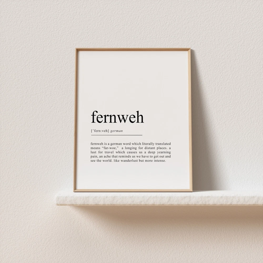 Fernweh Print Fernweh Definition German Gifts German Wall Art Germany Print Wanderlust Travel Lover Gift Material: Premium luster photo paper Print type: Inkjet printing One side printed + The finish provides the highest possible resolution and color saturation + Lasts up to 200 years in color and 400 years in black-and-white + Printed on high-quality resin-coated photo base paper medium + Posters can be hung with double-sided tape, tacks, or framed + Hand washing with a gentle cry cloth is recommended for extended durability I will hand select the best choice of paper for your chosen design to ensure top quality results for a beautiful, bright and luxurious print. All prints are sealed in cellophane slips for protection during transportation, and are shipped in a protective cardboard envelope.