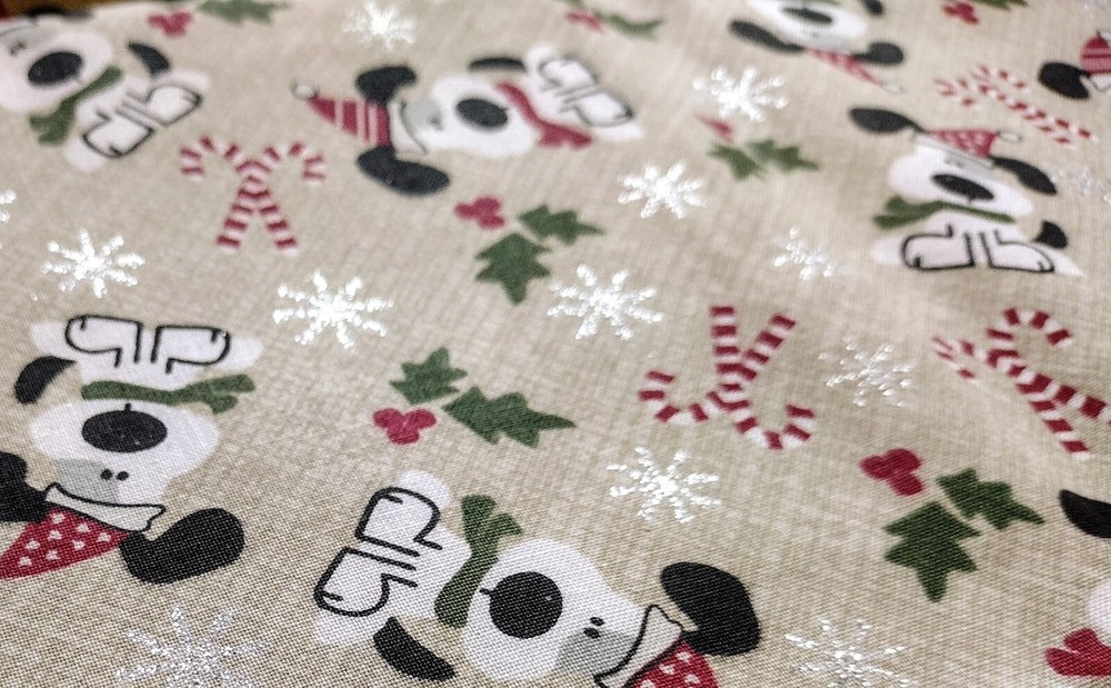 Tan background fabric with dogs, candy canes and snowflakes. Snowflakes are a shimmering silver. Fabric has precut edges. 20" x 43" section. Fabric can easily be cut to use for bandanas, quilting projects and various other crafts. I also have other bandanas and fabrics - see other listings. All fabrics and bandanas that I have available are either 100% cotton or a cotton blend. If you purchase more than 1 listing at a time, I will be happy to ship them together for you to reduce shipping charges.