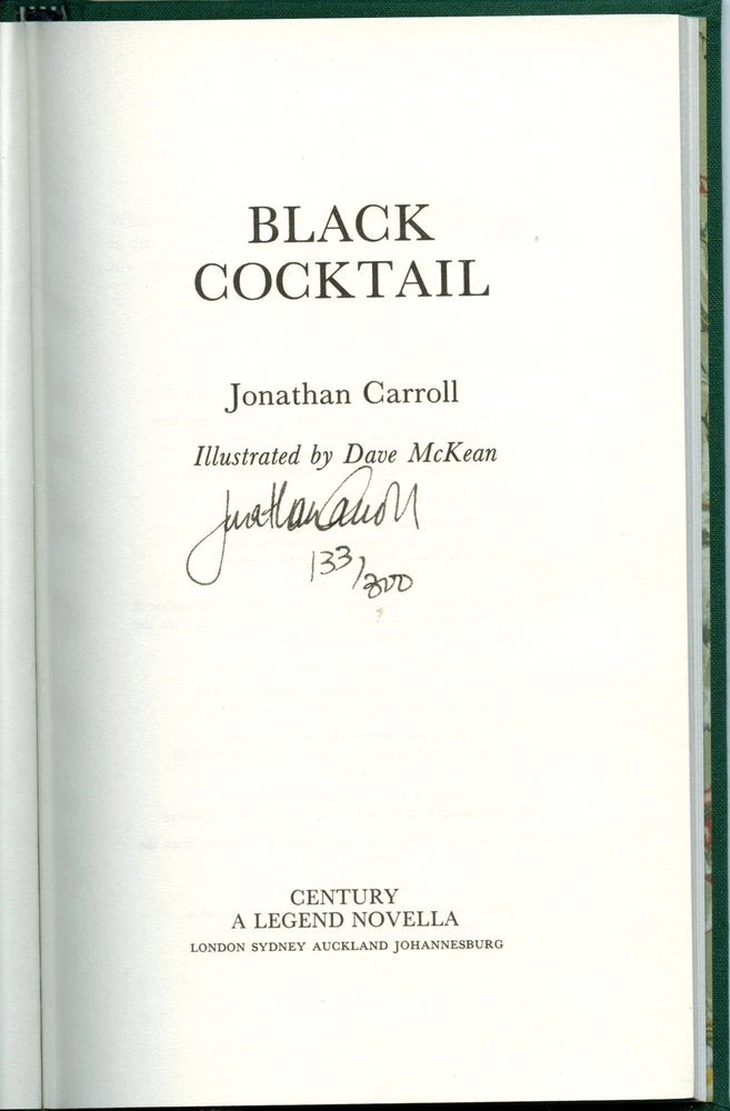 Fiction: BLACK COCKTAIL by Jonathon Carroll. Limited edition of 300, this book is #133. Signed on the title page by the author. In a cloth-covered cardboard slipcase. This is the fifth edition in the Legend Limited series published by Random Century. First Edition. By Carroll. Printed 1990. Published by Random Century Group, London. 5 1/2 inches wide by 8 3/4 inches tall. Slipcase is green cloth over cardboard, with silver stamping on one face. Book has green cloth covers with silver stamping on spine and front covers. Page edges are gilded in silver. 76 pages. Condition: Near mint. Slipcase shows virtually no wear, not even on the corners. Covers show almost no wear, same with edges. Corners are not bumped, spine edges are not rolled. Inner pages are lightly tanned and show little wear. No scribings or stampings within. Great condition for this set. Money back upon return if not satisfied or any problems with shipping within the US. Due to changes at the US Postal Service, we can no longer guarantee delivery on international mail.Thanks for looking. International Buyers – Please Note: Import duties, taxes, and charges are not included in the item price or shipping cost. These charges are the buyer's responsibility. Please check with your country's customs office to determine what these additional costs will be prior to bidding or buying. 03/20/12 0/8