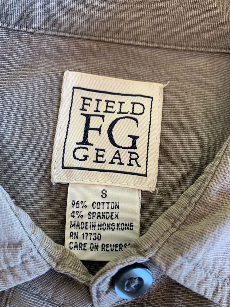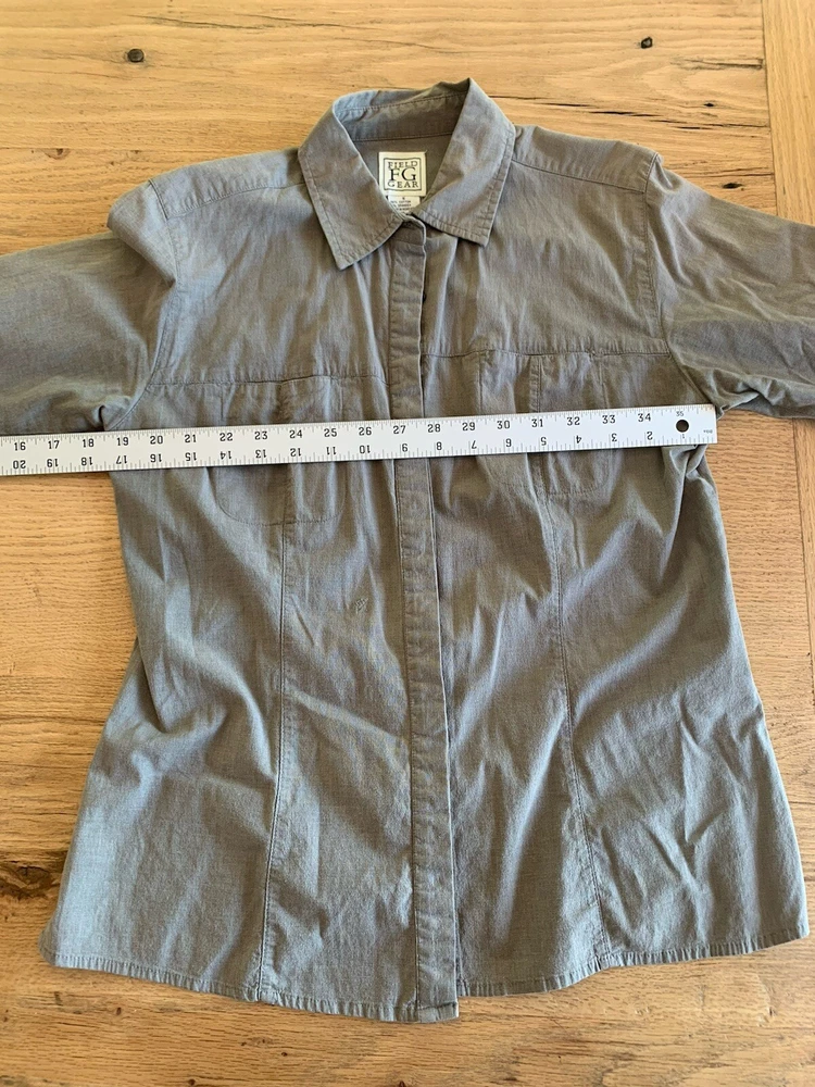 Field Gear 3/4 Sleeve Women’s Cotton Front Pockets Green Button Up Shirt Small Preloved Outdoors Casual Adventure Hiking Walking Camping Ships next day from Corvallis Oregon Smoke free environment Flaws shown in pics of any (very small repaired rip on front right panel)