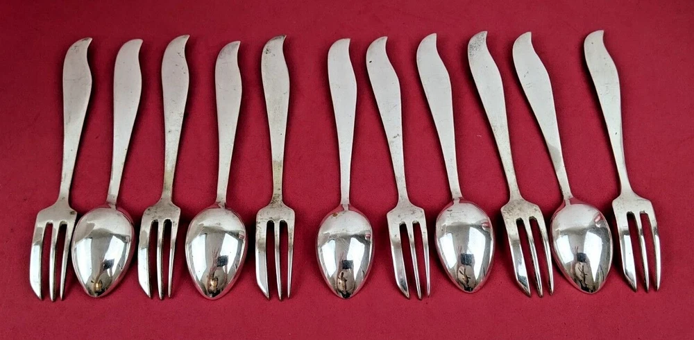 An antique Silver Dessert Set that I believe was purchased in France or Germany in the 1940s. All of the handles have a deep carved Rose pattern. There are 6 Pastry or Pie Forks that are 5 3/4" in length and 5 Coffee Spoons that are 5 5/8" in length. There are no markings or hallmarks that I can find. They are heavy quality piec es in very good well preserved condition.