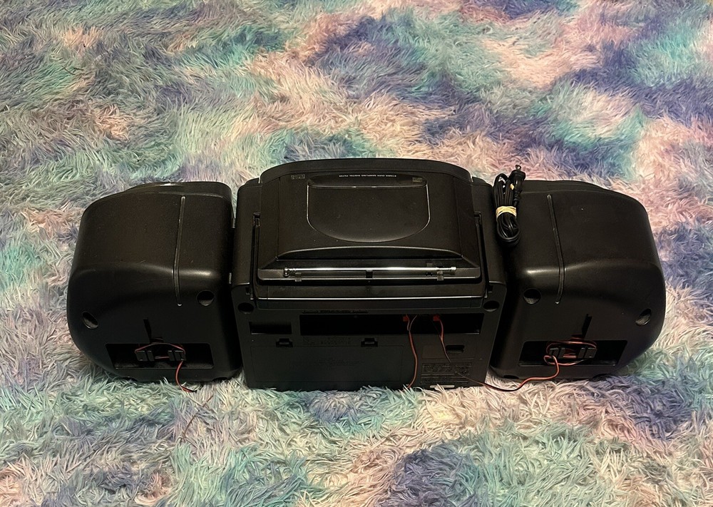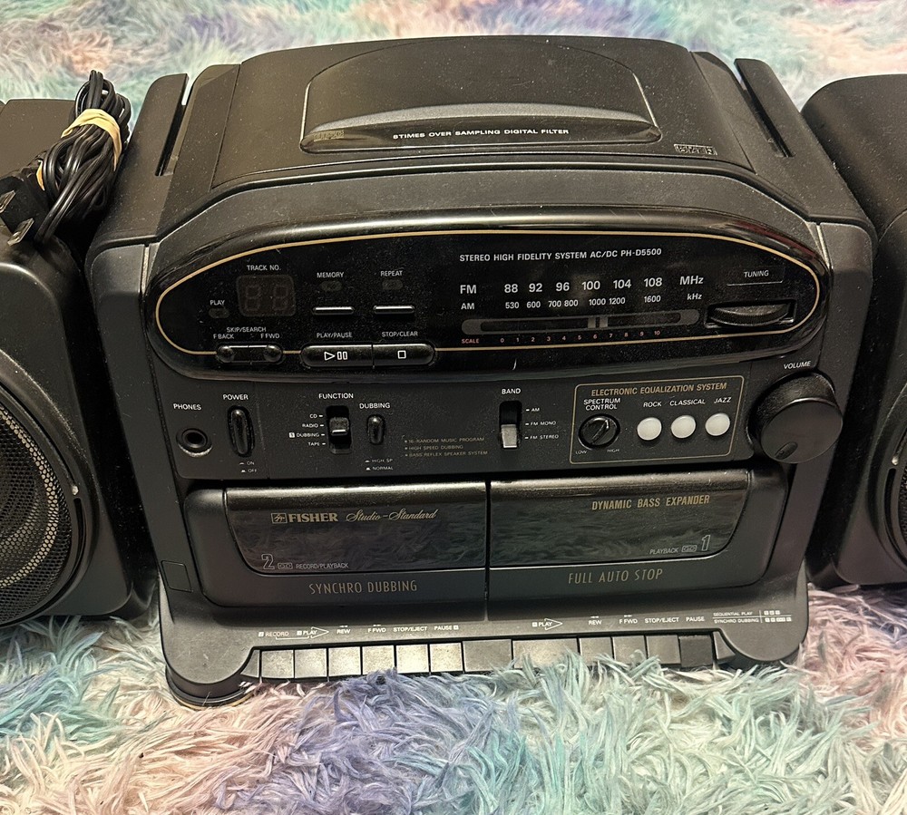 All besides cd player works. Introducing the Fisher PH-D5500, a vintage boombox that brings a classic touch to your music experience. This portable stereo cassette deck allows you to play your favorite tapes with ease. The device boasts a sleek design and is perfect for anyone who loves the retro vibe. With its Fisher brand, this boombox is a reliable and durable option for anyone who wants to enjoy their music on the go. Its model number PH-D5500 ensures that you are getting a high-quality product that delivers excellent sound quality. The boombox is ideal for those who want to relive the golden era of music or for anyone who loves a good vintage piece.