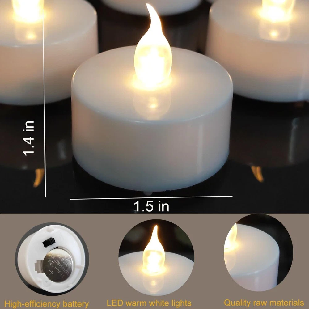LED tea light with remote control Features: 1.Safe for usage in any setting or occasion, there is no flame or smoke. 2.The Tea light Candles is designed to flicker in a realistic way so that one can feel the atmosphere of an actual candle flame without any hazard or hassles. 3.These electronic tea lights can also be given away as gifts or party favors. 4.Very easy to use, these led tealights can be turned on and off by the flick of a switch. Specification: 1.Material: LED+PP. 2.Size: Diameter 3.7 cm / 1.45 inch + Height 3.6 cm/1.42 inch. 3.Battery: CR 2032 button cell. 4.Battery life: 180+hours. 5.Light color: warm white Package include: 12 X battery tea lights + remote control+ 50PCS Petals. Q&A: Q1: Does it come with a remote control? A: Yes, it is with a remote control, ON/OFF switch on the bottom. You can use the ON/OFF switch and remote control. Q2: Does it with timer function? A: Yes, it is with 2H,4H,6H,8H timer setting. Q3: Is it rechargeable? A: No, it is not rechargeable. It is with 240mAh high-capacity CR2032 batteries, if the battery runs out, you can replace the old one with a new CR2032 battery. Q4: Would these fit in votive candle holders? A: Yes! The base is exactly the same size as a votive candle. Attention: It is best to use "OFF" to turn off the led tea lights when you are not using it for a long time, rather than using a remote control to turn off the led tea lights. Because in the "ON" state, the tea lights still needs to use flow, and if you want to use it for a longer time, try to use the "OFF" state when not in use 💖Remote Control & Timer Function - Allows you to display candles in hard to reach places. You can choose between 2/4/6/8 hour timers as well as static blinking light options and brightness levels. The timer loops every 24 hours 💖Long Battery Life -These remote control candles feature 240mAh high-capacity CR2032 batteries, The led tea lights can last over 100 hours in non stop using ,it is longer than most of other brand tealight with remote in the market ,big capacity battery means saving your money 💖Create a Cozy Ambiance: Our warm white LED tea lights provide the perfect touch of mood lighting for any occasion. Use them in votive holders, glass cups, or on their own to set the scene for a romantic dinner, a festive party, or just a quiet night at home. 💖Flameless and Safe - Lifelike look while unscented, no drips, no smoke, no hazard, our candles safely go where traditional flame candles can’t, perfect for your home with kids and pets. 💖Widely used - Battery candles with remote and timer Ideal for home decor, wedding centerpieces, parties, Valentine's Day, Easter, Halloween, and Christmas. Undoubtedly they will add to the fun and goodness of any occasion, they are the perfect combination of convenience and durability.