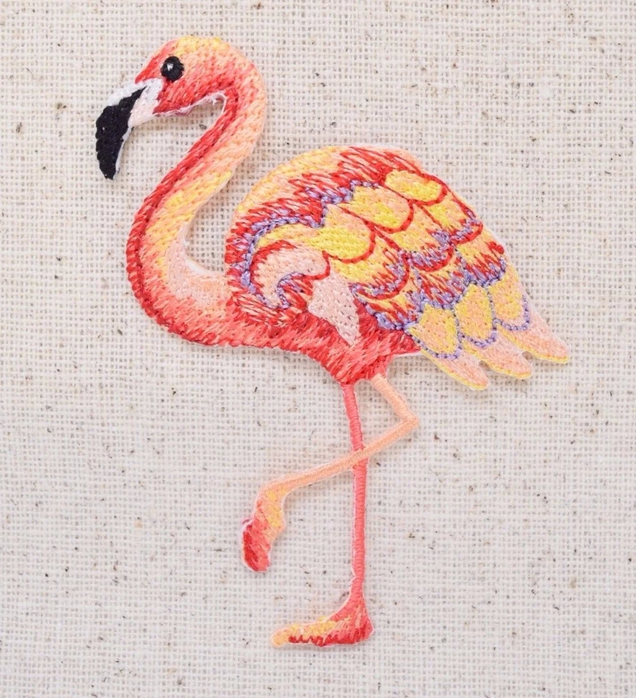 Flamingo Iron on Applique Size is approx. 2-1/4" x 3" (5.7cm x 7.62cm) High quality, detailed embroidery applique can be sewn or ironed onto polyester or cotton. Wash cold, dry on no-heat Easy DIY craft project for kids or beginners. Great for sweaters, beanies, hats, bags, jeans, jackets, clothing, masks, and more! Upcycle and be environmentally friendly! Patch up a hole or cover a stain and repurpose your wardrobe. Non-traditional uses: Make a keychain, a Christmas ornament, a decorative magnet, a pin for your jacket or hat, make wearable jewelry, or a greeting card! This patch comes ready to iron on, or you can sew this on with a sewing machine or sew a few tack stitches for a permanent application. If you want to add these to your shoes or a lamp shade, we recommend E6000 craft glue or simply use your hot glue gun. Embroidered patches are so versatile, you can personalize and decorate almost anything!