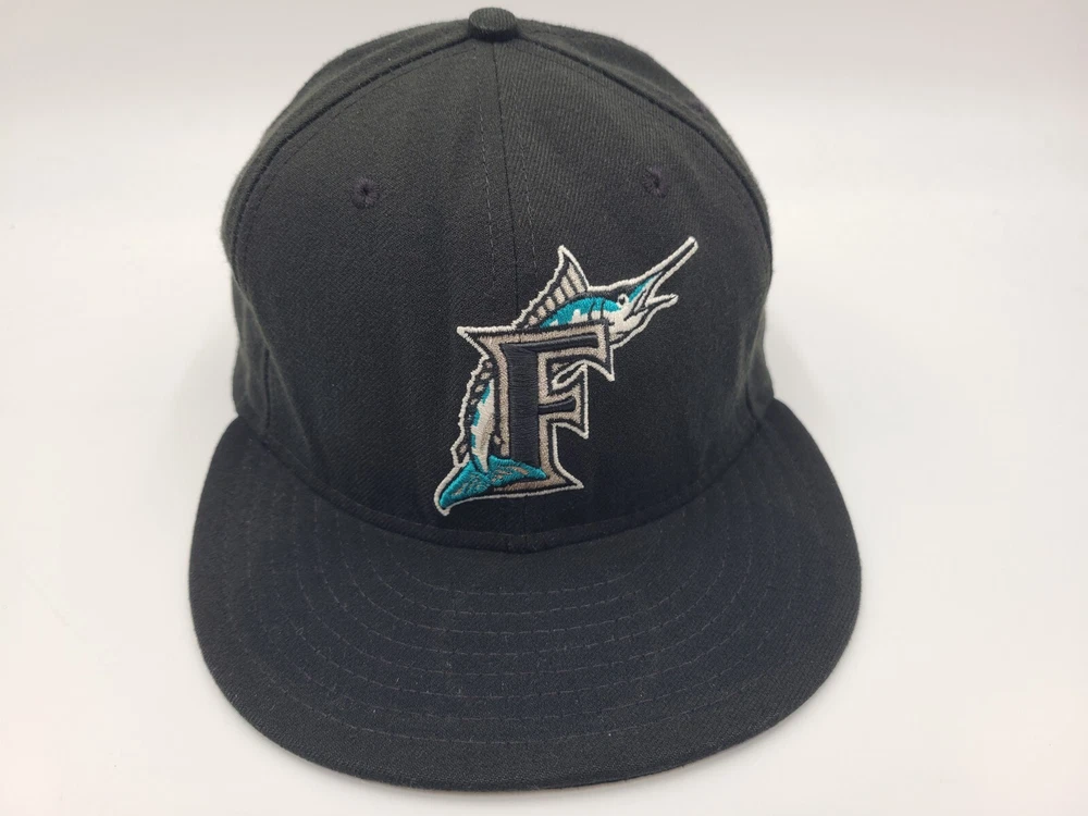 The brim is slightly misshapen as seen in photos. Also has a mark left over from the sticker on the brim and stains underneath the brim. Florida Marlins New Era 59Fifty Fitted 8 Hat Cap Miami Men MLB Baseball Black. EACH ADDITIONAL HAT PURCHASED IS ONLY $1 ADDED SHIPPING!