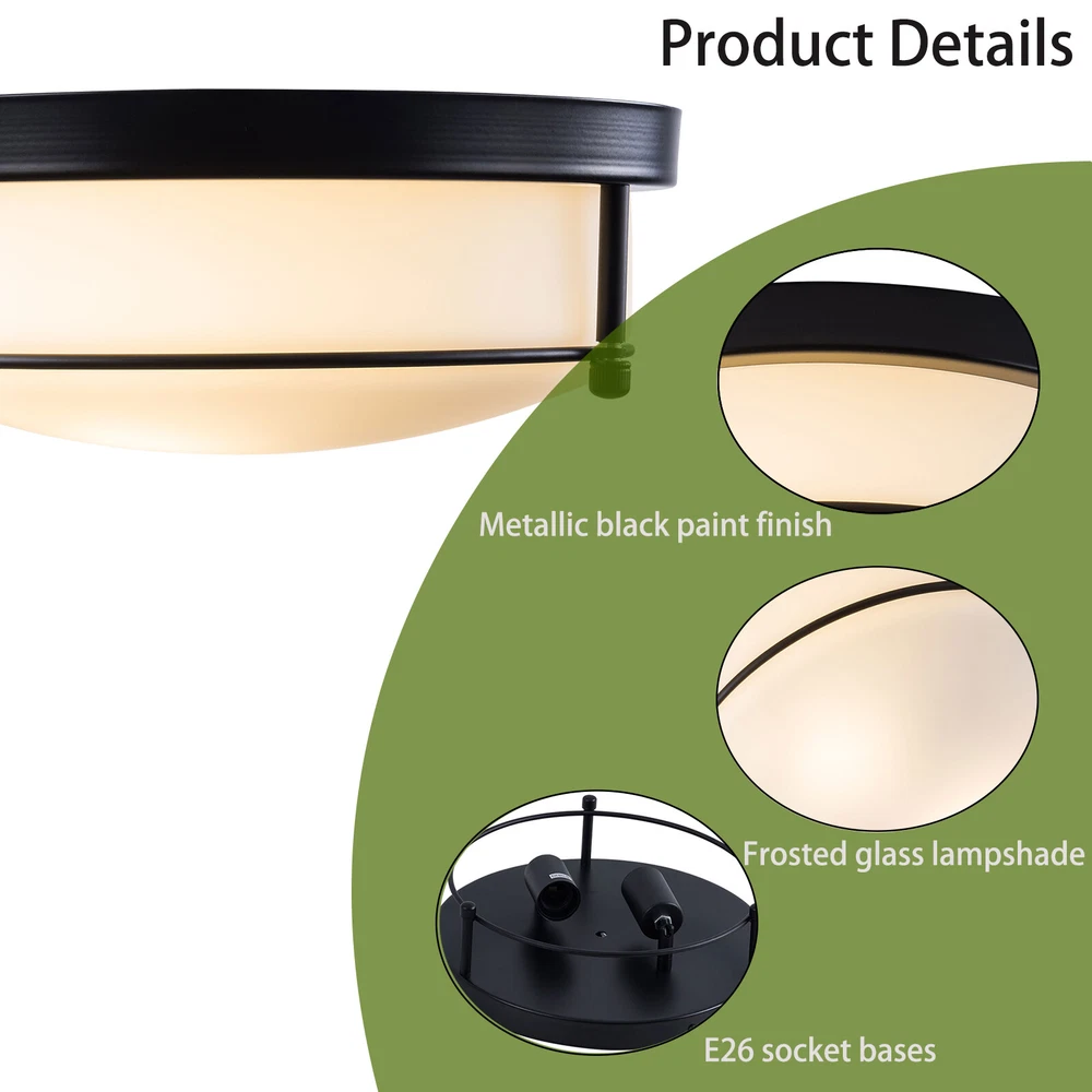 About this item MODERN DESIGN: The flush mount features metal frame in oil rubbed bronze finish, seeded glass lamp shade, with attractive farmhouse style, beautiful and durable. WIDELY APPLICATION: The modern style design of the lighting fixtures ceiling can integrate all decorations. The ceiling lamp is perfect for kitchen, bathroom, bedroom, living room, dining room, study room, porch and entryway, etc. BULB REQUIREMENTS: The bedroom lights for ceiling has two built-in E26 medium bulb bases, which support any LED/CFL/Edison bulbs with E26 bases, (Max 40W). When you use dimmer and dimmable bulb, the kitchen light fixtures ceiling can be dimmable. (Dimmers and bulbs are not included). EASY INSTALLATION: Dimension: 11.81''L x 11.81''W x 5.9''H. Hardwired, all installation acces Flush Mount Pendant Chandelier LED Ceiling Lighting Fixture Living Room Bedroom Welcome to my store Package Content 1 x Ceiling Light 1 x Instruction manual 1 x Hardware bag About this item MODERN DESIGN : The flush mount features metal frame in oil rubbed bronze finish, seeded glass lamp shade, with attractive farmhouse style, beautiful and durable. WIDELY APPLICATION: The modern style design of the lighting fixtures ceiling can integrate all decorations. The ceiling lamp is perfect for kitchen, bathroom, bedroom, living room, dining room, study room, porch and entryway, etc. BULB REQUIREMENTS: The bedroom lights for ceiling has two built-in E26 medium bulb bases, which support any LED/CFL/Edison bulbs with E26 bases, (Max 40W). When you use dimmer and dimmable bulb, the kitchen light fixtures ceiling can be dimmable. (Dimmers and bulbs are not included). EASY INSTALLATION: Dimension: 11.81''L x 11.81''W x 5.9''H. Hardwired, all installation accessories and installation instructions are included for quick and easy installation BULB REQUIREMENTS: 2*E26 Bulbs: No includes 2*E26 bulbs . The modern ceiling light allows you to change any color temperature bulb to get different lighting effects. Compatible with Led/Edison/Incandescent bulbs (110V-120V, 40W Max). Flat/ Ceiling Available & Wide Application: The hallway light fixture is compatible with flat/solp ceilings. This modern flush mount light fixtures is the perfect option for brightening up indoor areas like the kitchen island, dining room, living room, bedroom, bathroom, girls room, restaurant, entryway, corridor, hallway, foyer and etc. Voltage: 110-120V,It can be dimmable when you used with a dimmable bulb and compatible dimmer switch. Application Widely:used in your indoor space, such as bedroom, closet, hallway, foyer, dining room, living room, entryway, kitchen, make up room, kid room, bar, aisle, hotel, restaurant, office, parlor, loft. Easy to Assemble: Installation instruction and all mounting hardware are in the package for quick and easy installation. Installation Instruction: ①For your safety, Please turn off the power before installation ② Please check parts against the packing list to see if the accessories are available. ③We provide install instructions for you. please referred to install manual or have a professional electrician. If need any help, please contact us. Payment Delivery details Terms of sales About us Contact us Payment We accept ebay payment 。 Fees such as import duties, taxes are not included in the item price or shipping costs. These charges are the buyer's responsibility. Delivery details Shipping: 2-9 working days to: USA Terms of sales We maintain high standards of excellence and strive for hundred percent customer satisfaction. Feedback is very important to us. We hope that you contact us immediately before you give neutral or negative feedback, so that we can address your concerns. It is impossible to address issues if we do not know about them! About us Your satis faction is our ultimate goal. We work hard to earn your trust and future business. Our certified technicians have tested each item before shipping. The unit comes with 1 year limited warranty on all manufacturing defects. a) If you receive a defective item, you may return it or ask for a discount. Please contact us within 14 days after you receive the package. b) What you returned must be intact and in its original packaging as re? u. Customer is responsible for shipping costs of the returned item. c) We will cover the cost of shipping back t with the shipping rate indicated in the registration page. We will send you a new unit or refund the full payment you paid. Thank you. Contact us Business Hour Business Hour: Monday To Friday: 8:30 AM to 5:00 PM (Beijing China time) Due to time zones, our reply to your questions may not be immediately. But within above working time, we will reply your email within 24 hours. If it's non-workdays, please kindly be patient and wait till Monday. Please contact us with ebay message. Please feel free to contact us if you have any questions. Monday To Friday: 8:30 AM to 5:00 PM (Beijing China time) Due to time zones, our reply to your questions may not be immediately. But within above working time, we will reply your email within 24 hours. If it's non-workdays, please kindly be patient and wait till Monday. Please contact us with ebay message. Please feel free to contact us if you have any questions. On Nov 11, 2024 at 23:49:56 PST, seller added the following information: