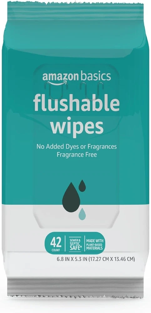 Amazon Basics Flushable Adult Toilet Wipes, Fragrance Free, 126 Count (3 Packs of 42) Packaging May Vary About this item Includes 3 packs of 42 flushable wipes, 126 total wipes Previously Solimo Flushable Adult Toilet Wipes, Fragrance Free 100% biodegradable wipes when disposed of in the toilet, are made with plant-based fibers and plastic-free Flushable wipes made with Advanced Flushable Technology means you can feel confident flushing one wipe at a time No added dyes Packaging made with at least 25% Post Consumer Recycled Material