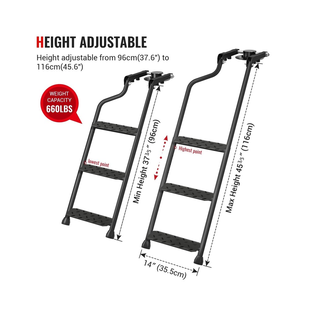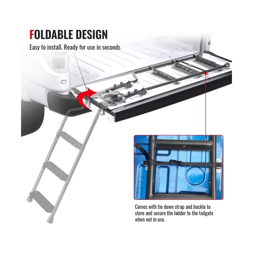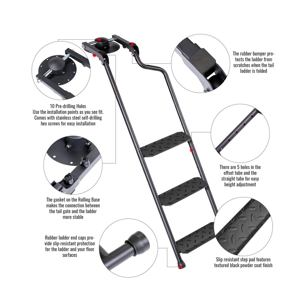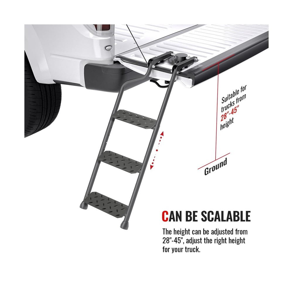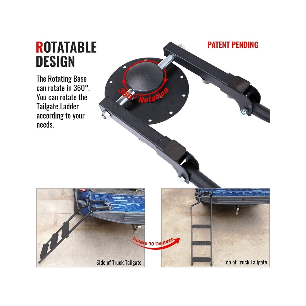 AA Products Tailgate Ladder Foldable Pickup Truck with Wide Pedal Non-Slip Sturdy Easy Install Durable Steel Omni-Directional Ladder Rack Capacity 660 lb(USPTO Patent Pending) Product Details Color: 02-black-upgraded Version With Wide Pedal Brand: AA Products Inc. MPN: PTL-02 UPC: 810029495035 EAN: 0810029495035 Material: Iron Brand: AA Products Inc. Product Dimensions: 3.5"W x 10.6"H Color: 02-black-upgraded Version With Wide Pedal Special Feature: Foldable Material: Iron Brand: AA Products Inc. Product Dimensions: 3.5"W x 10.6"H Color: 02-black-upgraded Version With Wide Pedal Special Feature: Foldable Item Weight: 14.47 Pounds Load Capacity: 660 Pounds Maximum Height: 45 Inches Manufacturer: AA Products Inc. UPC: 810029495035 Number of Steps: 3 Model: PTL-02 Item Weight: 14.47 pounds Country of Origin: China Item model number: PTL-02 Manufacturer Part Number: PTL-02 Special Features: Foldable Date First Available: April 15, 2022 SAFE AND STABLE: wide pedals, sturdy steel frame, non-slip rubber feet and metal crossbars provide safety and support when you stand, work and complete tasks, and greatly increase your sense of security ADJUSTABLE DIRECTION: The Tailgate ladder adopts a Omni-directional base, and the round pipe connection makes it not only rotatable in the horizontal direction, but also in the vertical direction to meet all the use requirements STURDY AND ROBUST: This ladder is cast of thick iron with weatherproof powder coating. Significant prevention of surface oxidation or scratch. Professional anti-slip pads on the bottom make the ladder more stable and protect the ladder from ground wear HEIGHT ADJUSTABLE, EXCELLENT LOAD BEARING: This rear gear ladder is adjustable from 37.6 inches to 45.6 inches. Make this pickup accessories to be made of matching heights of 28-45 " trucks. This product expansion and smooth and the load-bearing capacity is excellent at up to 660 lb The installation process is very simple and easy to use. The disc base has 20 holes pre-drilled to allow the required mounting points with sufficient stainless steel self-drill hexagon screws. You can also turn on the rear baffle, and use the attached toughness to strengthen the strap fixation
