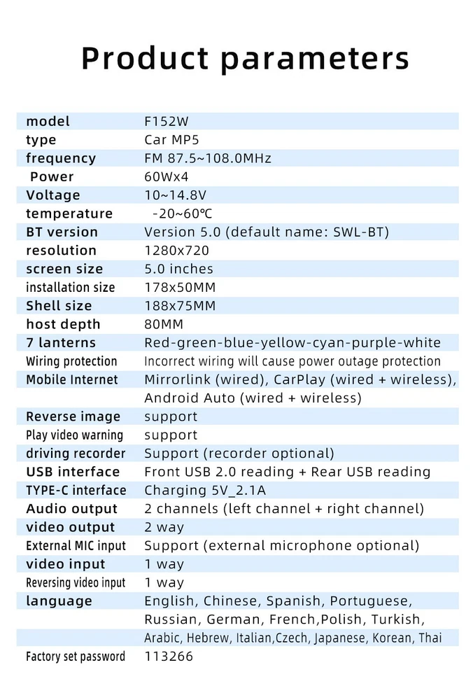 Home Payment Shipping About us Contact us Store Categories Store Categories Other Details Car Radio 1 Din Wireless CarPlay Android Auto Car Stereo 5in Radio Multimedia MP5 Player Bluetooth Handsfree Mirror Link FM Note:Please check size with your car Product selling points: ♦ The wiring protection function directly reduces the customer complaint refund loss by at least 20% for cross-border customers (customers install wiring themselves, and if the positive and negative poles cannot be clearly distinguished, it will normally directly burn out the machine motherboard or fuse, leading to customer complaints of returns or negative reviews. Our latest research and development of this product's power cord can be easily connected N times without burning the machine and fuse until the customer connects it correctly); ♦ High definition reverse video input (camera optional), automatically switches to full screen reverse image when the vehicle is in reverse gear, intelligent assistance for safe reverse; ♦ Mobile car mode, connected to CarPlay or Android Auto, allows your machine to use various functions of the phone; Basic parameters Type: single din System:wide Melis system Software solution: F133 Bluetooth chip: AB5301B Power amplifier chip: CD7388CZ Radio IC: QN8035 Output power: 60Wx4 Working voltage: 10-14.8V Working temperature: -20~60 ℃ Bluetooth version: 5.0 (default name: SWL-BT) CPU: F133 Running memory: 1Gbit DRAM Display resolution: 1280x720 Screen size: 5.0 inches Installation size: 178x50MM Shell size: 188x75MM) Host depth :80MM Functional parameters Mobile internet: support Reverse image: support Video playback warning: support Driving recorder :support (optional recorder) USB interface: USB 2.0 read x2 Audio output: 2 channels (left channel+right channel) Video output: 2 channels External microphone input: support (optional external microphone configuration) Video input: 1 channel Reverse video input :1 channel Language parameters:English, Chinese, Spanish, Portuguese, Russian, German, French, Polish, Türkiye, Arabic, Hebrew, Italian, Czech, Japanese, Korean, Thai Factory Set Password: 113266 Accessories 1. Host 2. Instructions 3. Power cord 4.21 key silicone remote control (accessories, instructions, and packaging may be updated from time to time, subject to actual receipt) Basic functions 1. FM radio 2. Read USB flash drive (audio/video/images) 3. Bluetooth function 4. RCA audio output can be connected to a subwoofer 5. Reverse rearview function 6. Video input and output functions 7. Original car steering wheel learning function 8. Wired mobile phone interconnection wired and wireless Android AUTO/Apple CarPlay 9. Colorful lighting 10. Rear USB 11. Power supply positive and negative pole reverse connection protection function, the wrong connection of the positive and negative poles of the power line will not cause circuit board burning 12. TYPE-C interface charging function Shipping Policy Payment Method Returns Policy Shipping Policy Payment Method Returns Policy Home Payment Shipping About us Contact us Home Payment Shipping About us Contact us Store Categories Store Categories Details Car Radio 1 Din Wireless CarPlay Android Auto Car Stereo 5in Radio Multimedia MP5 Player Bluetooth Handsfree Mirror Link FM Note:Please check size with your car Product selling points: ♦ The wiring protection function directly reduces the customer complaint refund loss by at least 20% for cross-border customers (customers install wiring themselves, and if the positive and negative poles cannot be clearly distinguished, it will normally directly burn out the machine motherboard or fuse, leading to customer complaints of returns or negative reviews. Our latest research and development of this product's power cord can be easily connected N times without burning the machine and fuse until the customer connects it correctly); ♦ High definition reverse video input (camera optional), automatically switches to full screen reverse image when the vehicle is in reverse gear, intelligent assistance for safe reverse; ♦ Mobile car mode, connected to CarPlay or Android Auto, allows your machine to use various functions of the phone; Basic parameters Type: single din System:wide Melis system Software solution: F133 Bluetooth chip: AB5301B Power amplifier chip: CD7388CZ Radio IC: QN8035 Output power: 60Wx4 Working voltage: 10-14.8V Working temperature: -20~60 ℃ Bluetooth version: 5.0 (default name: SWL-BT) CPU: F133 Running memory: 1Gbit DRAM Display resolution: 1280x720 Screen size: 5.0 inches Installation size: 178x50MM Shell size: 188x75MM) Host depth :80MM Functional parameters Mobile internet: support Reverse image: support Video playback warning: support Driving recorder :support (optional recorder) USB interface: USB 2.0 read x2 Audio output: 2 channels (left channel+right channel) Video output: 2 channels External microphone input: support (optional external microphone configuration) Video input: 1 channel Reverse video input :1 channel Language parameters:English, Chinese, Spanish, Portuguese, Russian, German, French, Polish, Türkiye, Arabic, Hebrew, Italian, Czech, Japanese, Korean, Thai Factory Set Password: 113266 Accessories 1. Host 2. Instructions 3. Power cord 4.21 key silicone remote control (accessories, instructions, and packaging may be updated from time to time, subject to actual receipt) Basic functions 1. FM radio 2. Read USB flash drive (audio/video/images) 3. Bluetooth function 4. RCA audio output can be connected to a subwoofer 5. Reverse rearview function 6. Video input and output functions 7. Original car steering wheel learning function 8. Wired mobile phone interconnection wired and wireless Android AUTO/Apple CarPlay 9. Colorful lighting 10. Rear USB 11. Power supply positive and negative pole reverse connection protection function, the wrong connection of the positive and negative poles of the power line will not cause circuit board burning 12. TYPE-C interface char